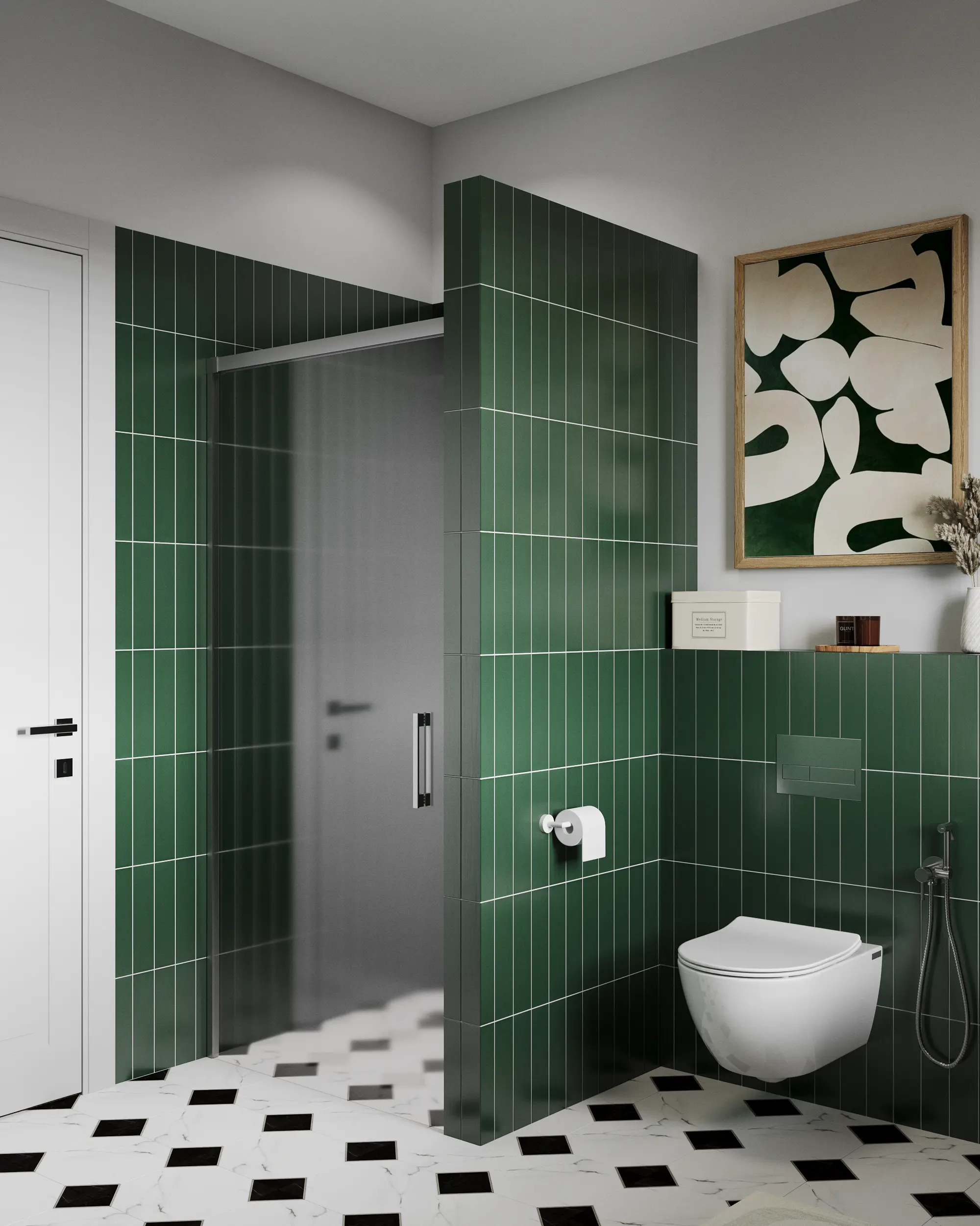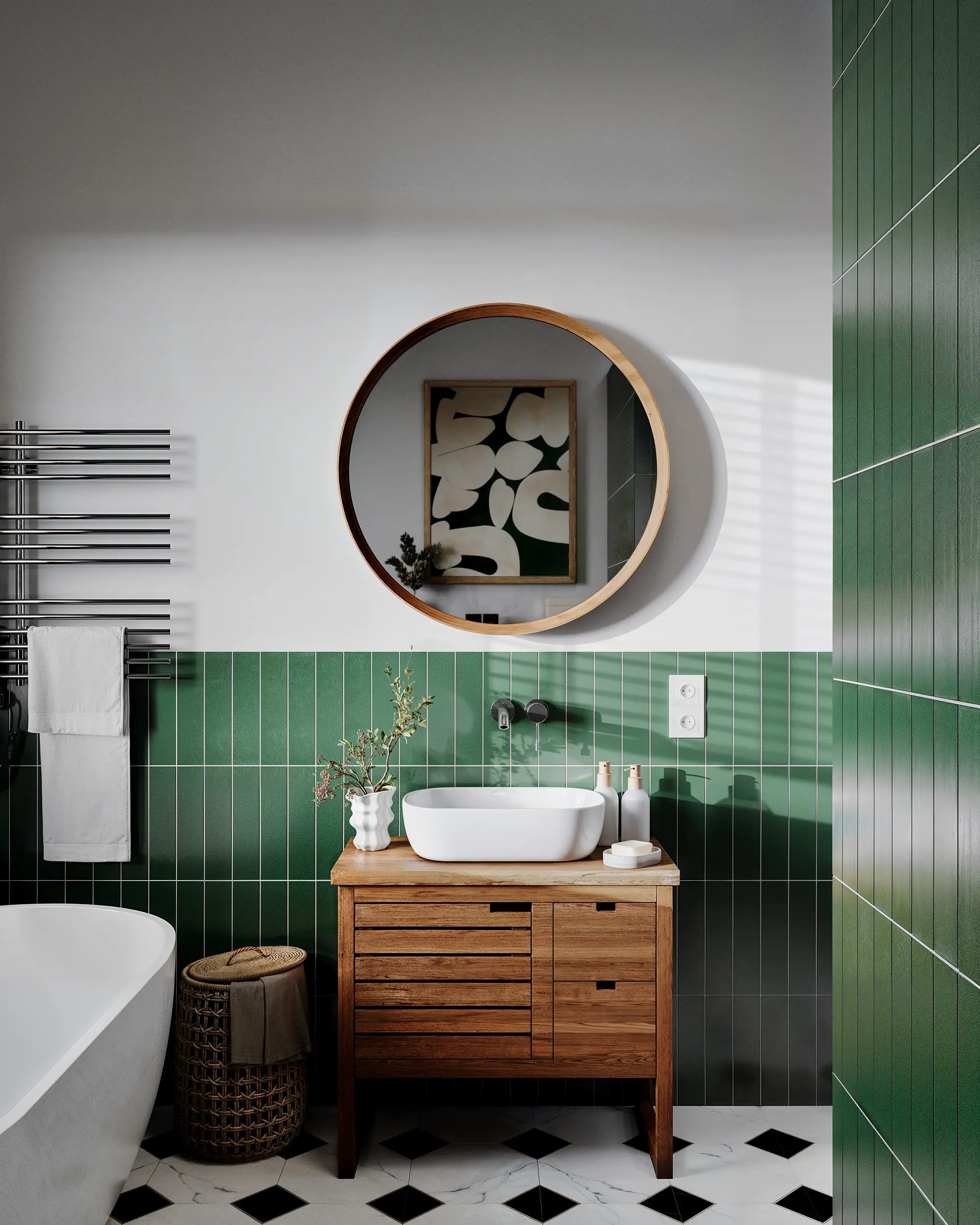 The bathroom serves as the design "surprise" of the house. Unlike the pastel living areas, this space features bold emerald vertical tiles and a black-and-white marble floor. Wooden furniture softens the cold ceramics, making the space functional yet visually striking.