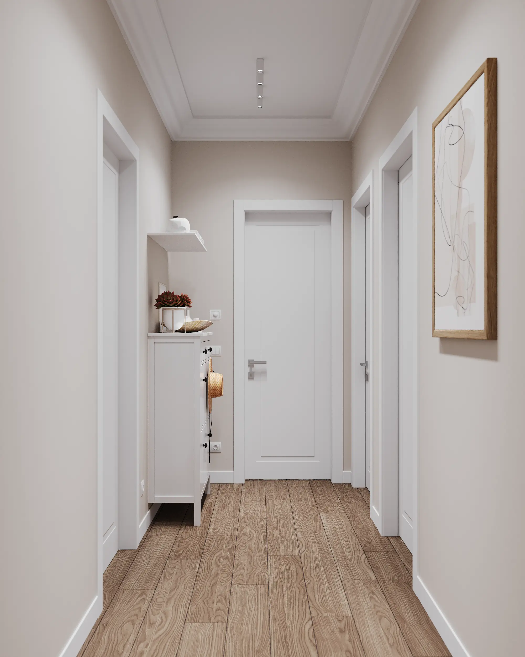 The entrance area is as minimalist as possible. The hallway acts as a gallery, using graphic posters to break the visual "tunnel" effect.