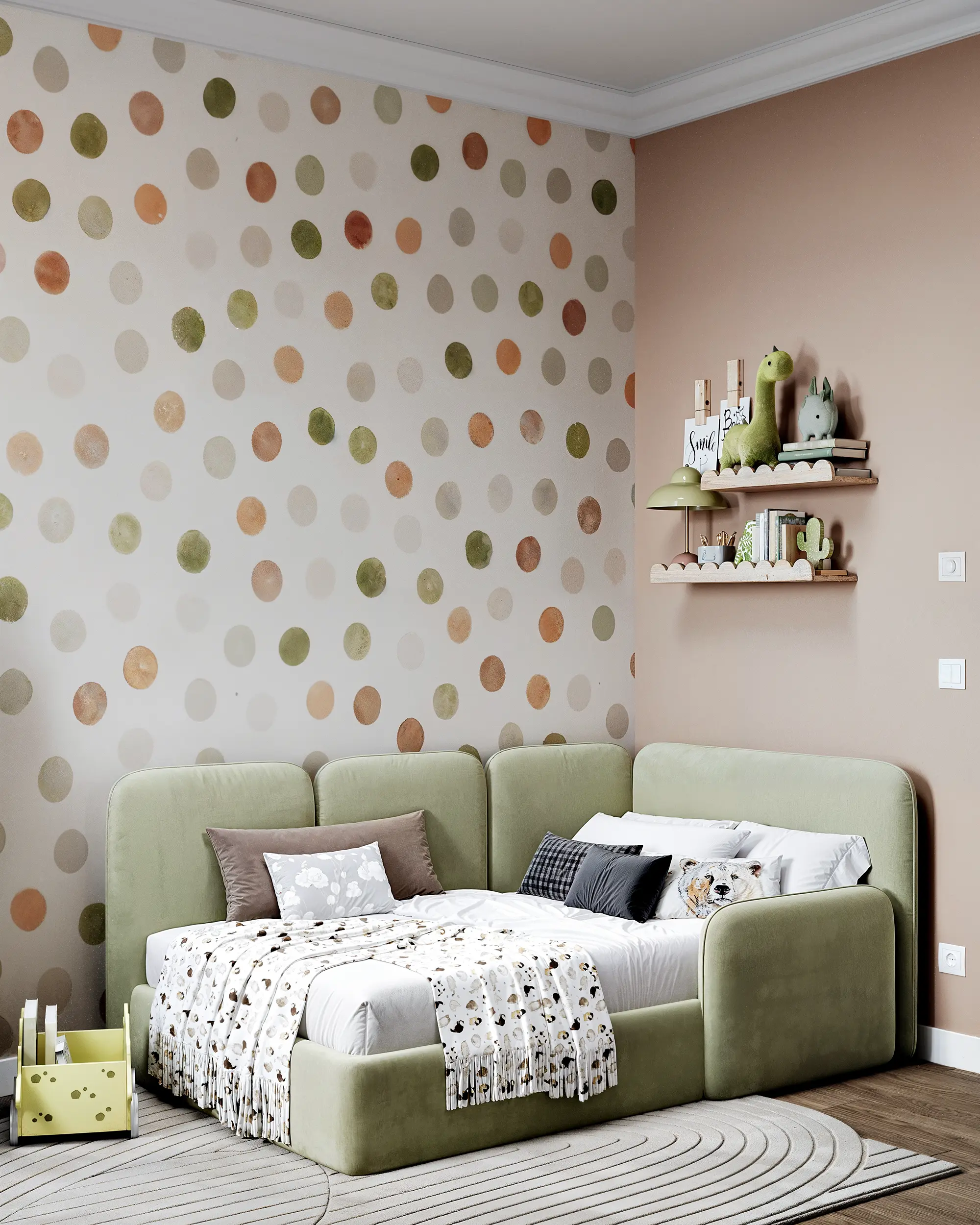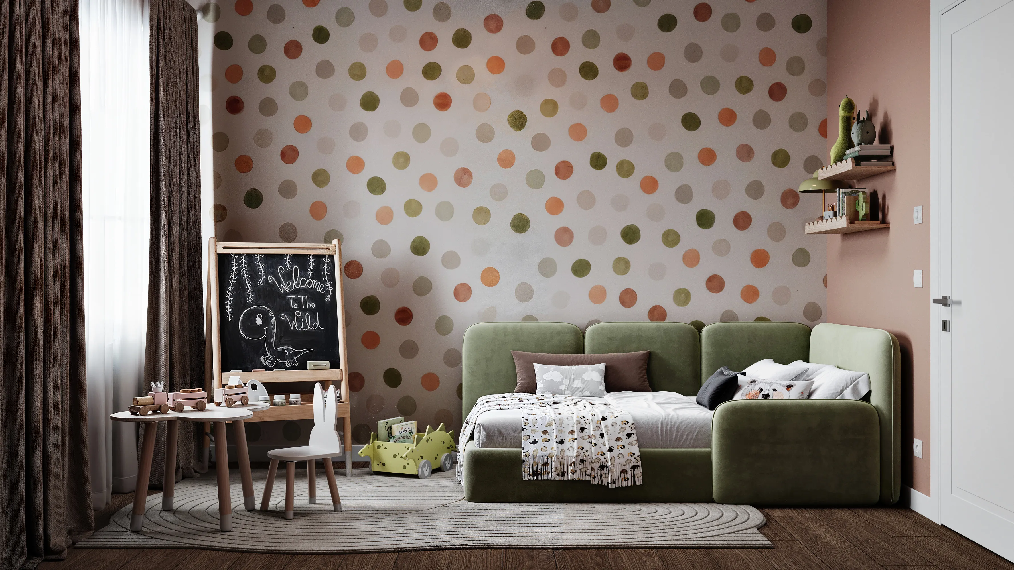 The child's room is designed with a playful palette of olive and terracotta circles. We prioritized independence (Montessori style): storage is placed at the child's height, and a chalkboard wall invites creativity. A green sofa bed makes the room versatile for sleep and play.