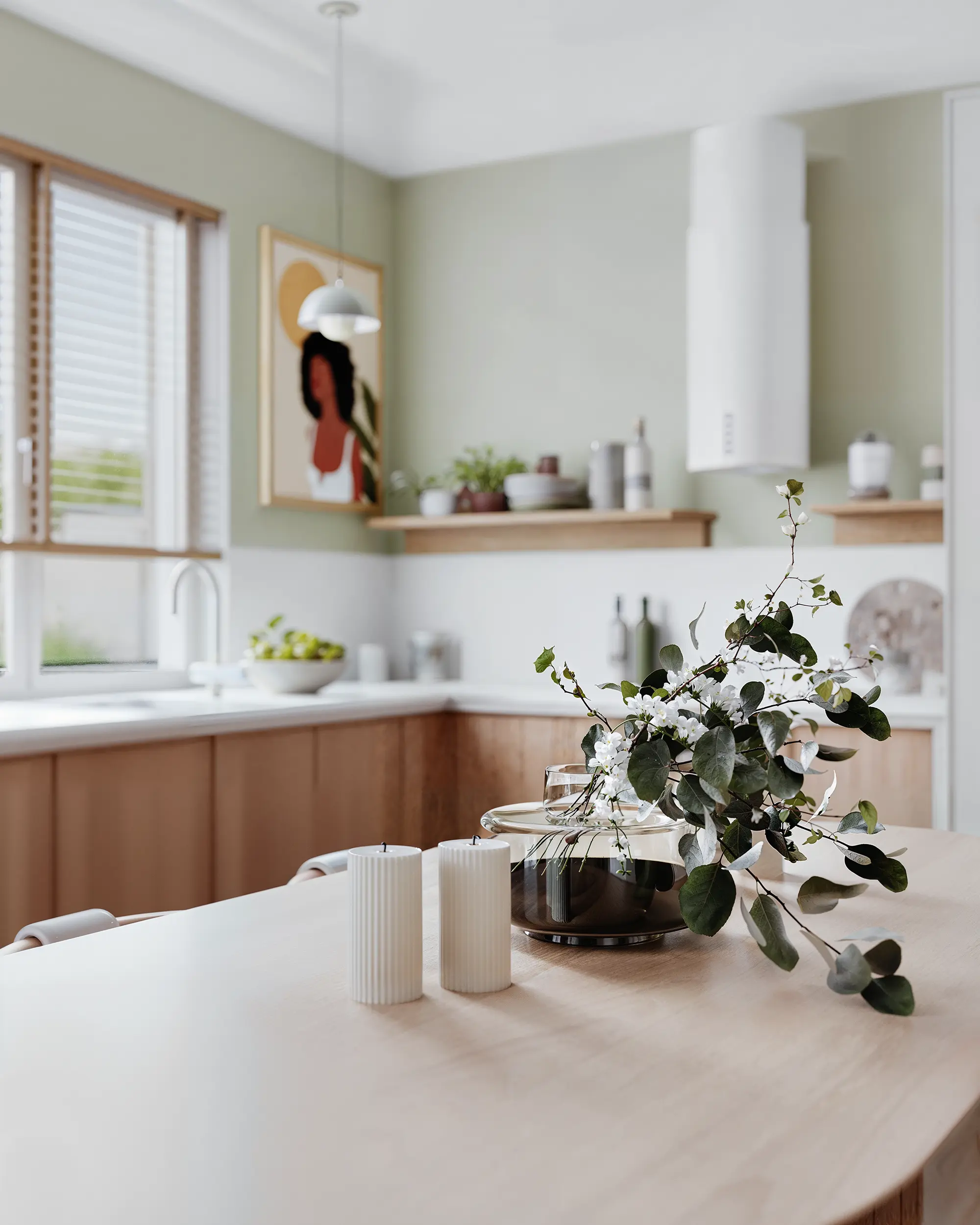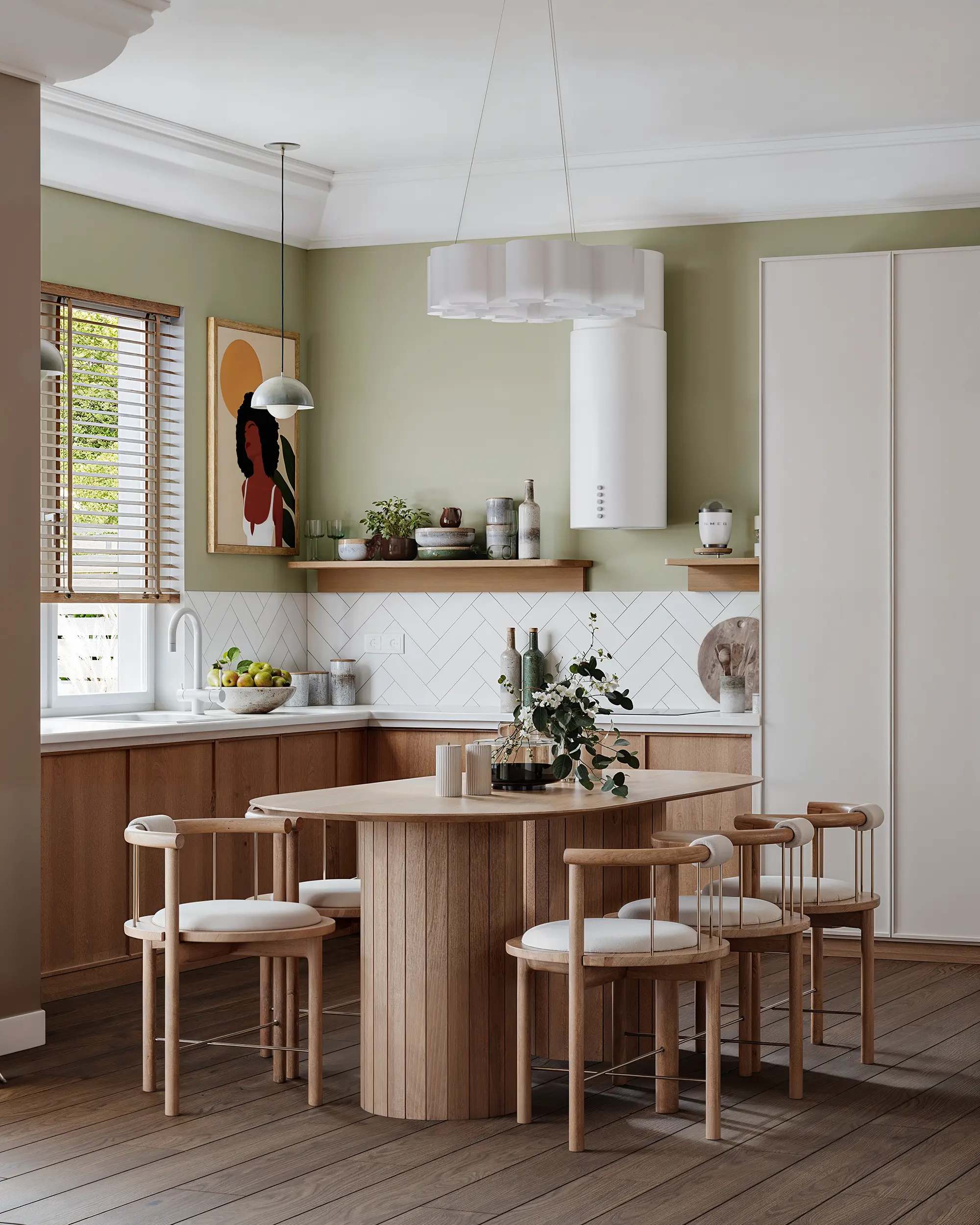 The kitchen combines natural veneer lower cabinets with light upper modules that seem to "dissolve" into the walls. An olive accent strip above the backsplash and white herringbone tiles add freshness without overwhelming the space.