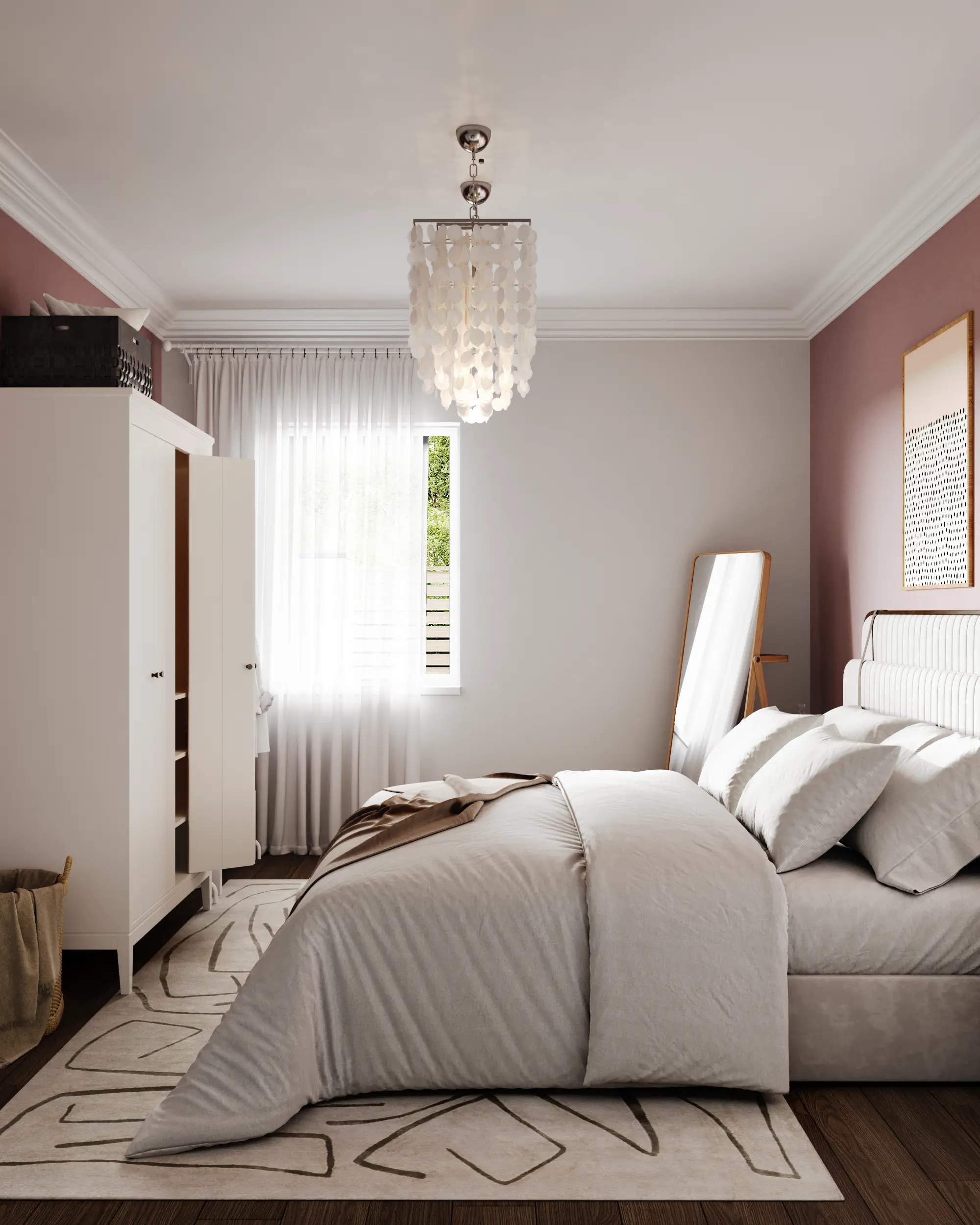 In the master bedroom, a soft dusty-pink accent wall sets the atmosphere. We paired this with "honey-colored" wood furniture and soft, airy textiles to create a sensation of lightness and absolute comfort for the owners.
