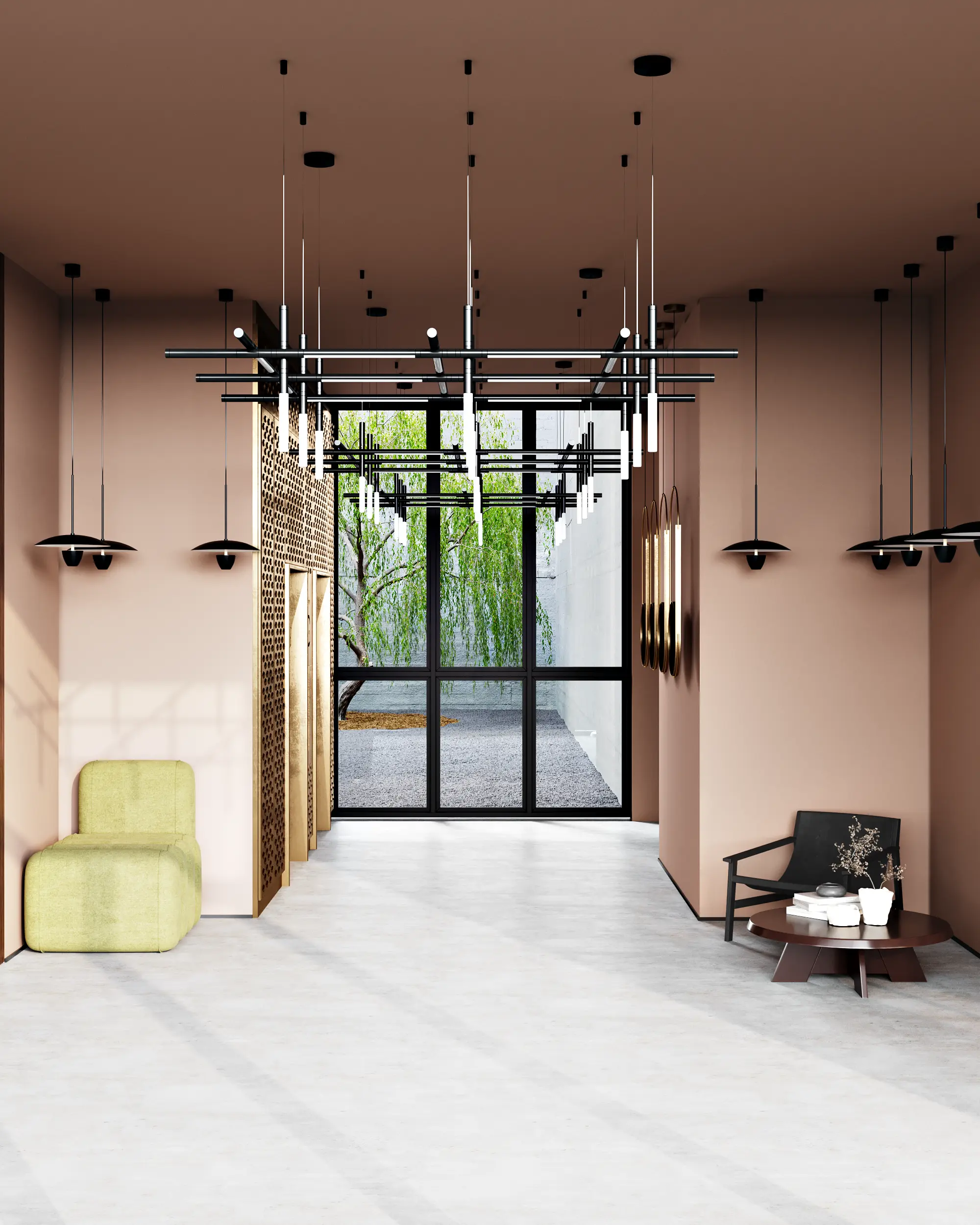 Moving from the exterior to the interior, we started with the most important public space, the entrance group. Here, our task went beyond visualization as we developed the design concept of a modern, multi-functional lobby.