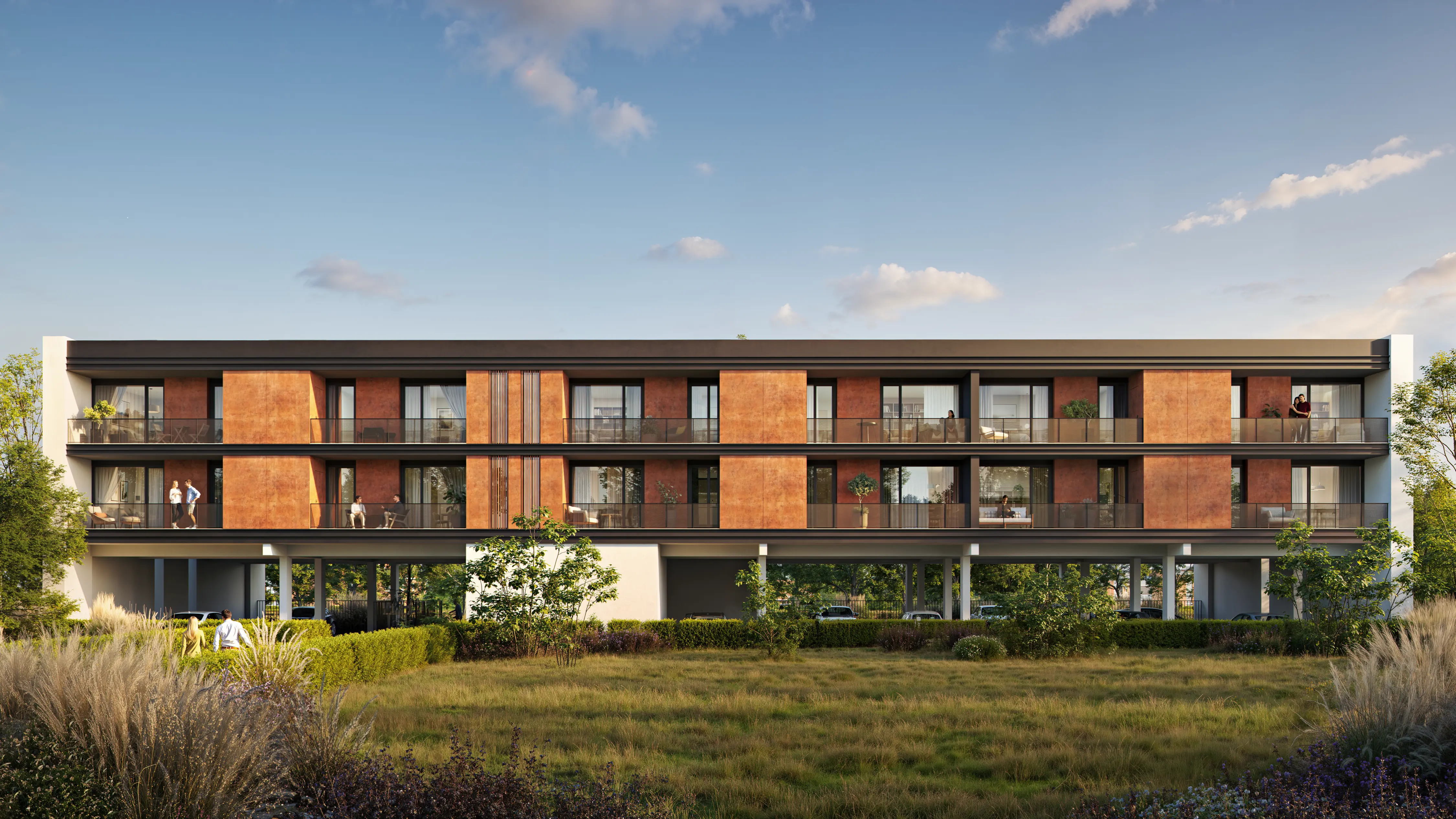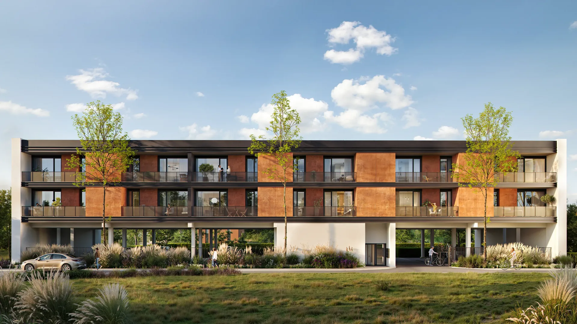 We visually emphasized the comfort of living in the new building. Cozy spacious balconies create an atmosphere of private relaxation. A modern bicycle parking area highlights care for the comfort of future residents.