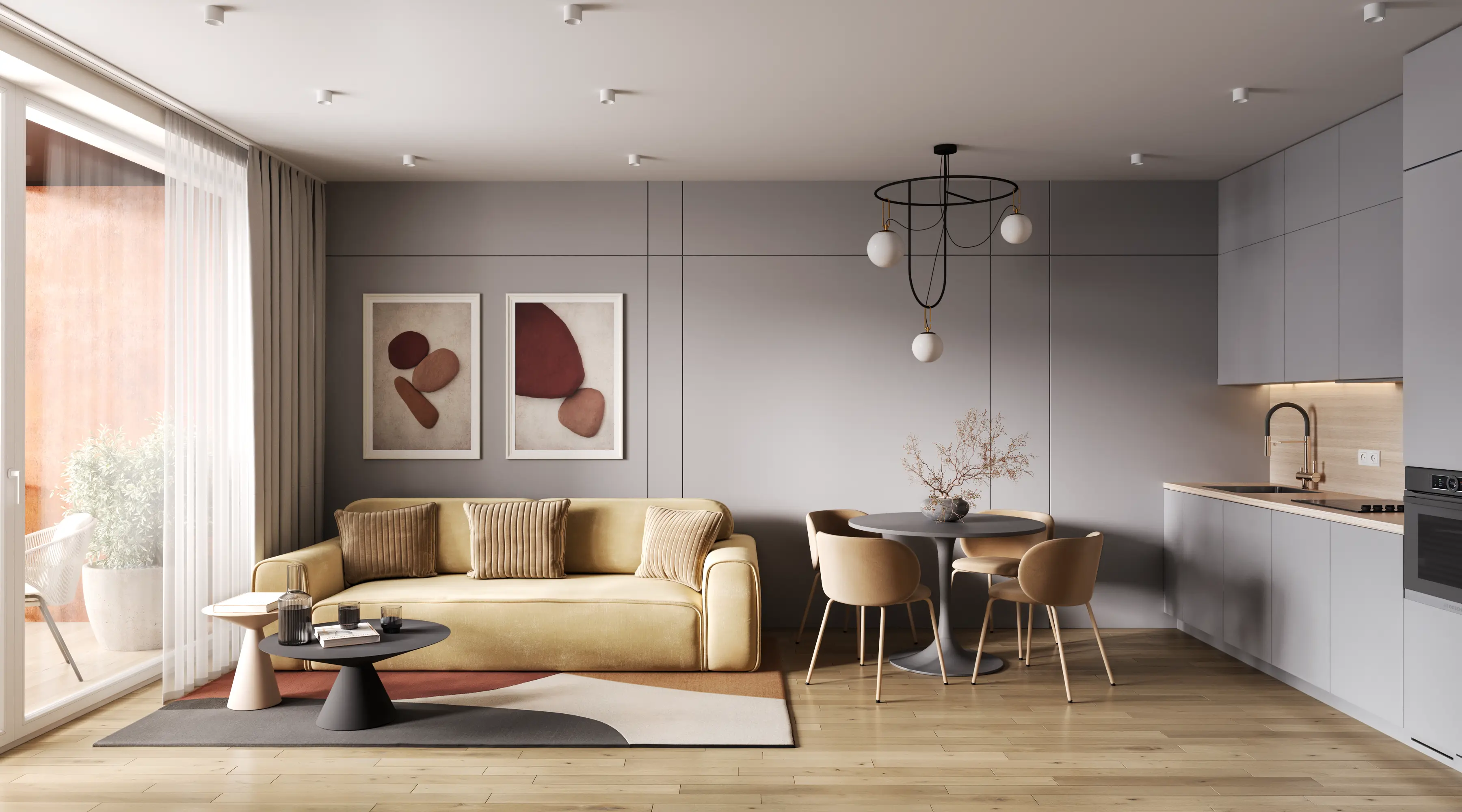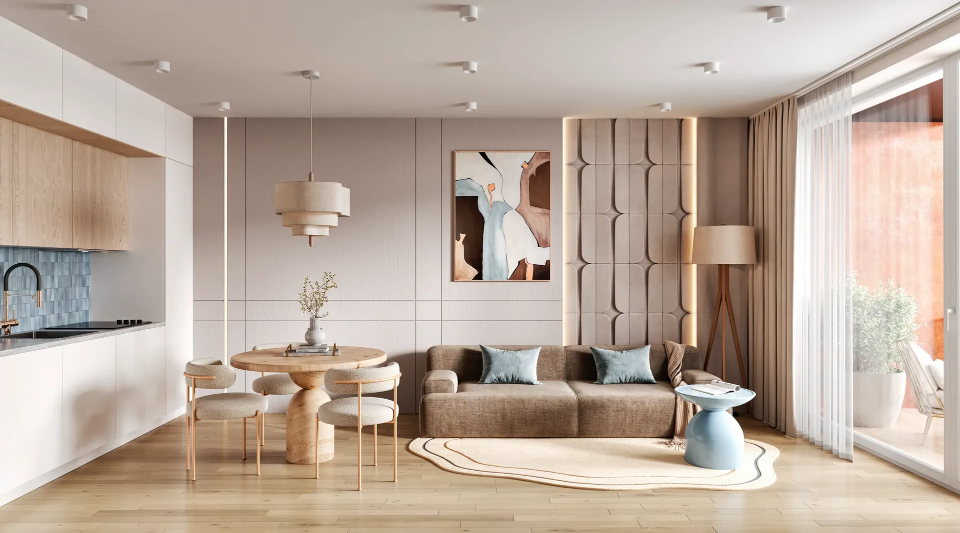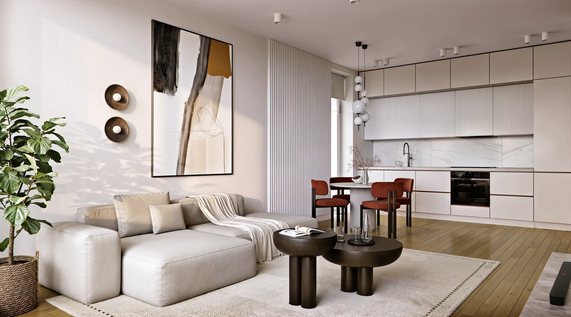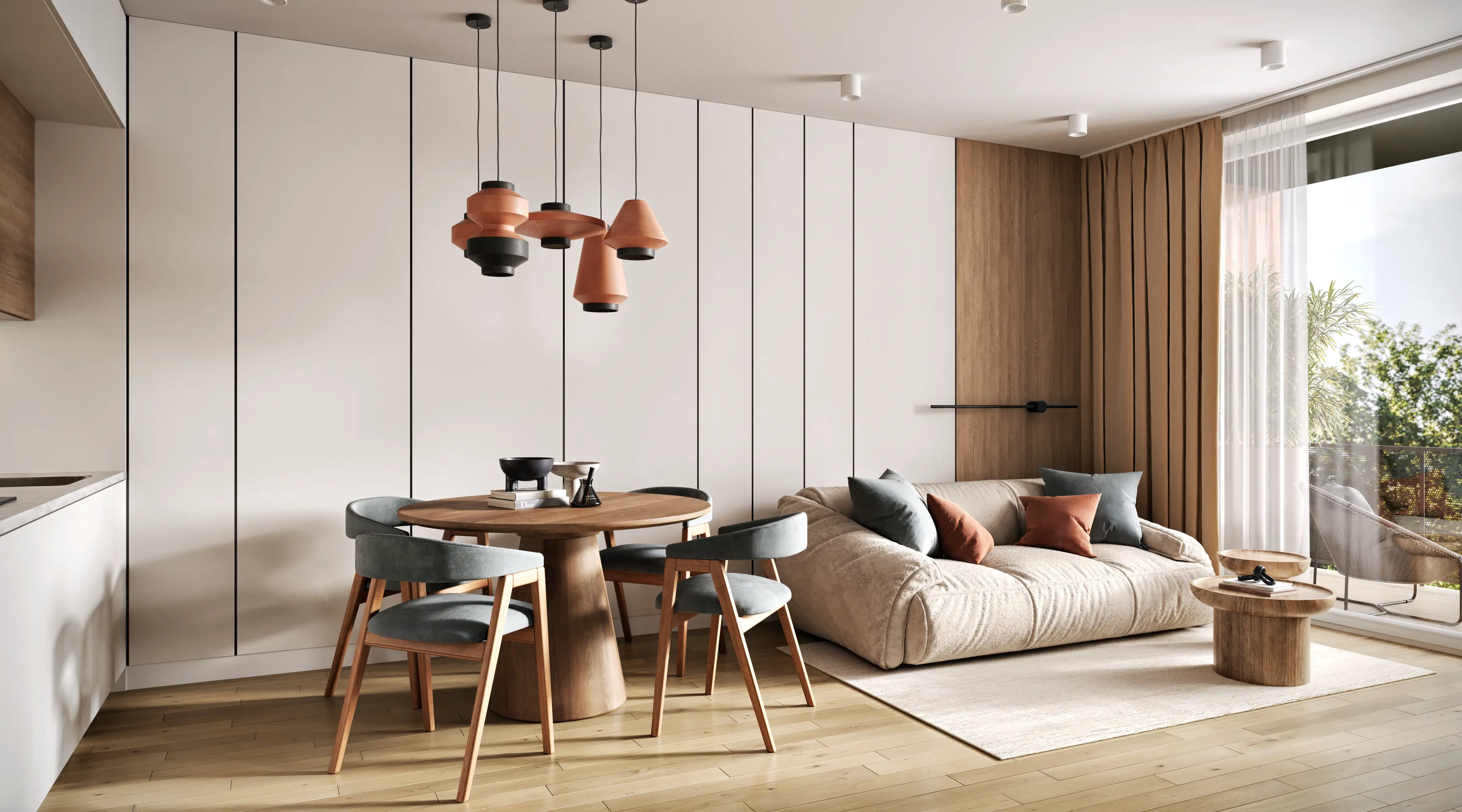We solved the main problem of typical residential developments. The property catalog should not look like a boring grid of identical images. Our team developed twenty-four unique interior designs for the kitchen-living rooms. The room geometry remained unchanged. Every apartment received its own unique character and an attractive hero-render.
