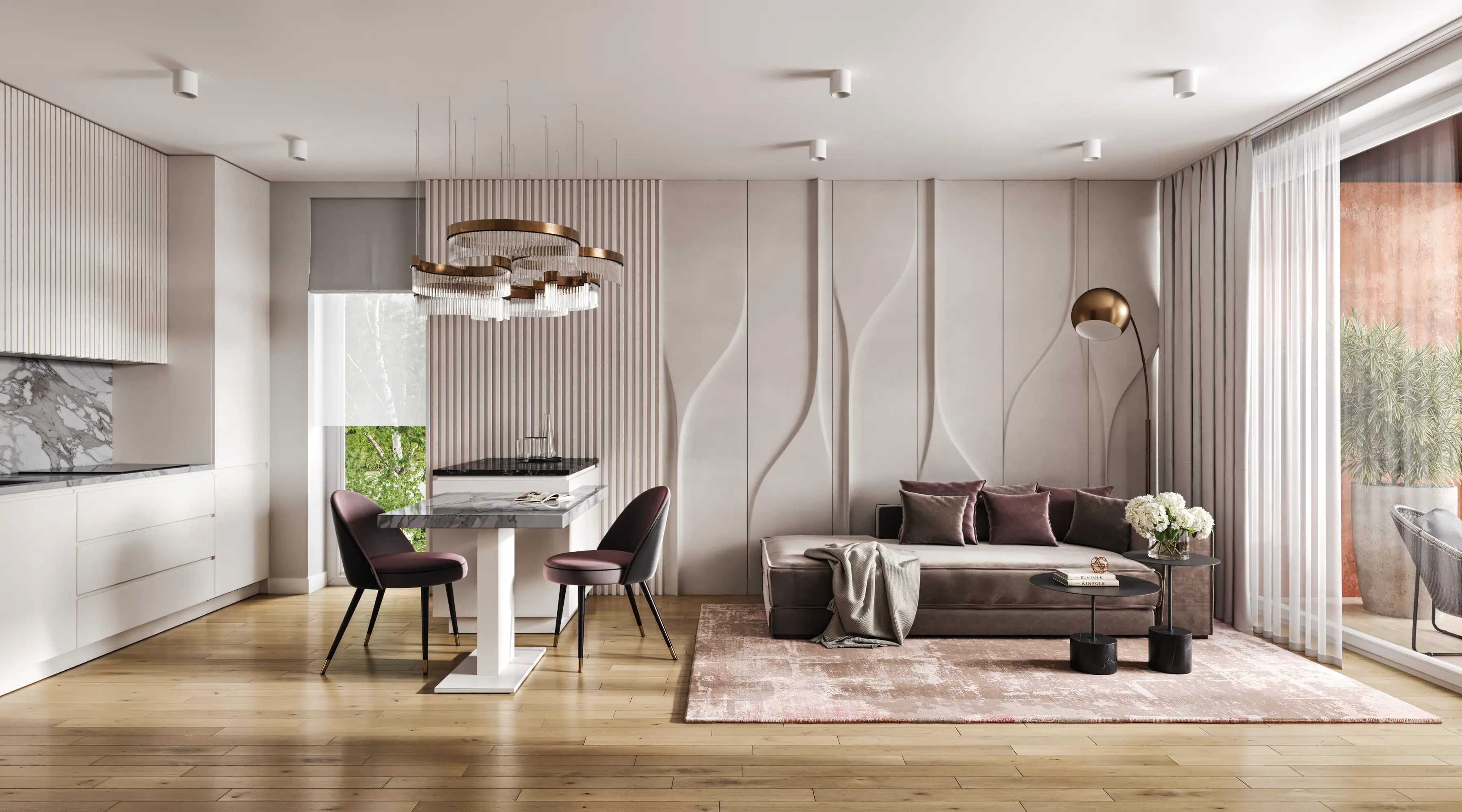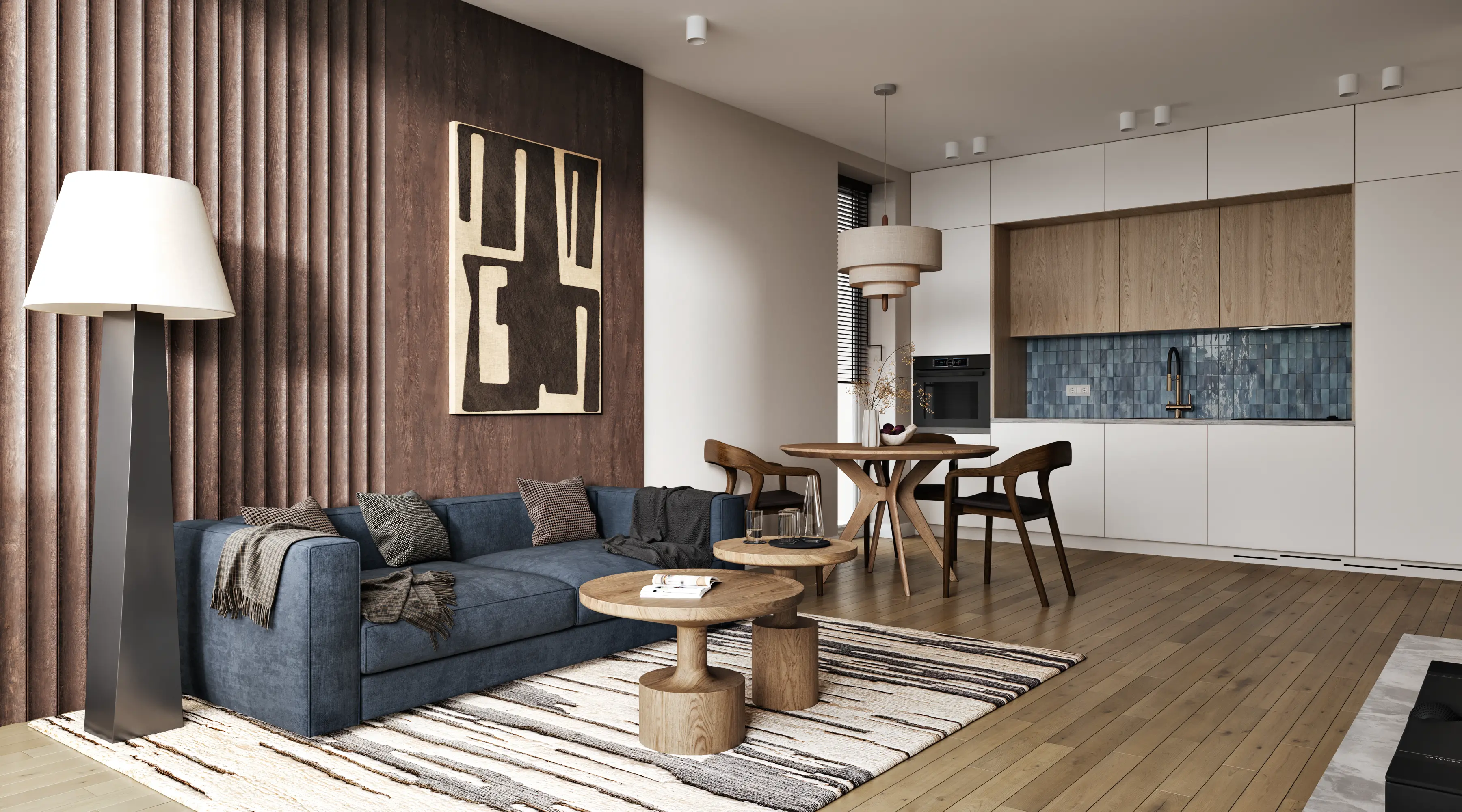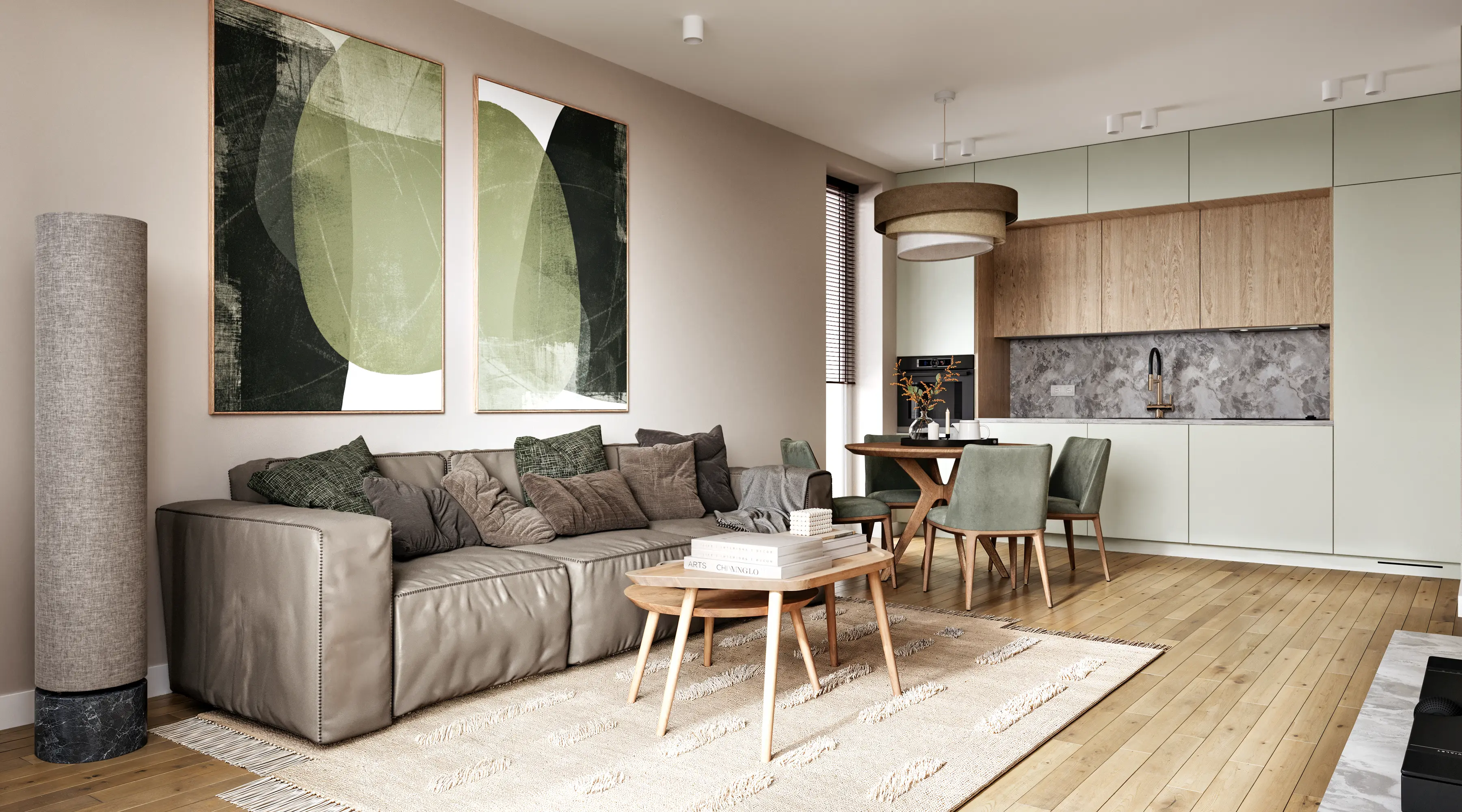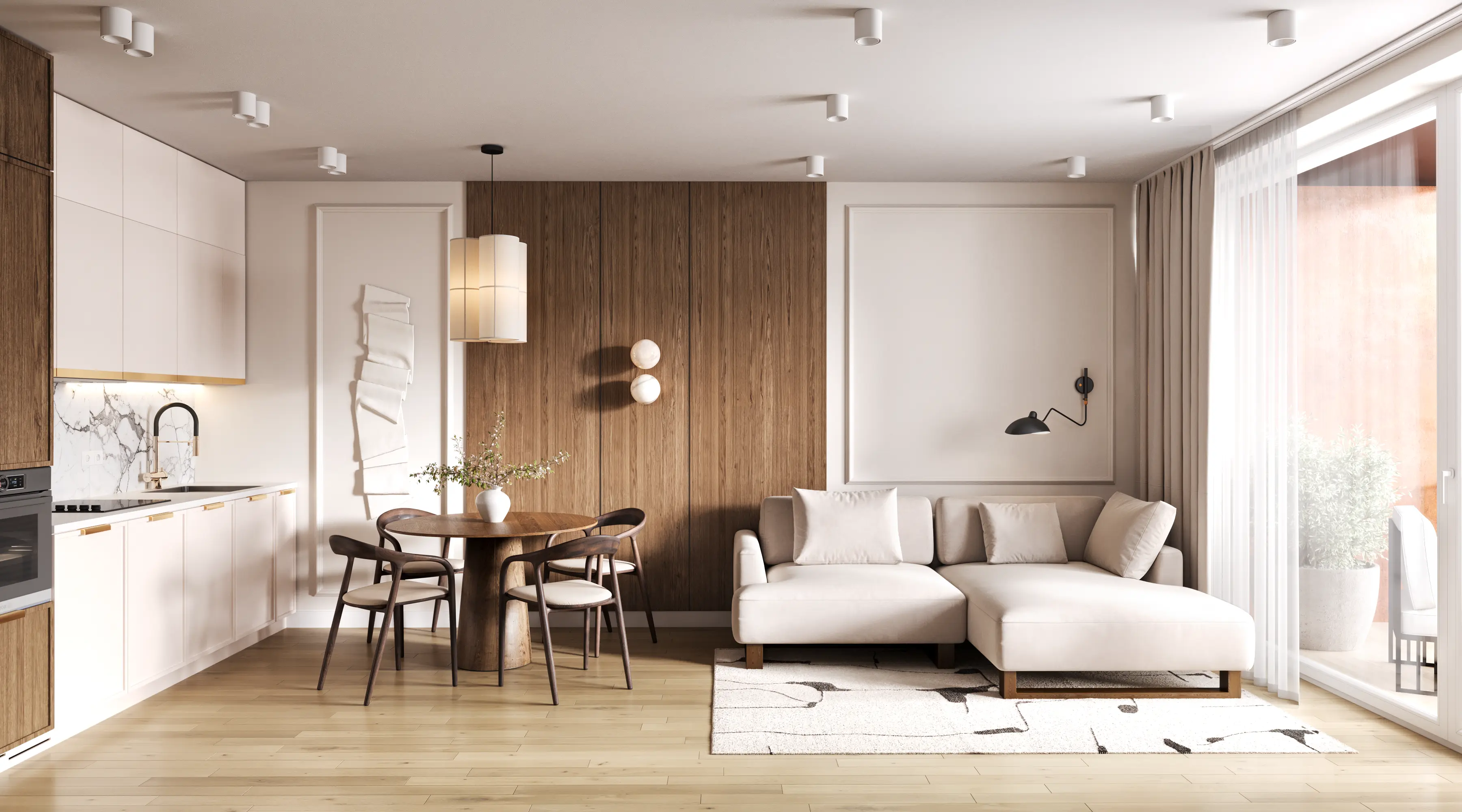We solved the main problem of typical residential developments. The property catalog should not look like a boring grid of identical images. Our team developed twenty-four unique interior designs for the kitchen-living rooms. The room geometry remained unchanged. Every apartment received its own unique character and an attractive hero-render.