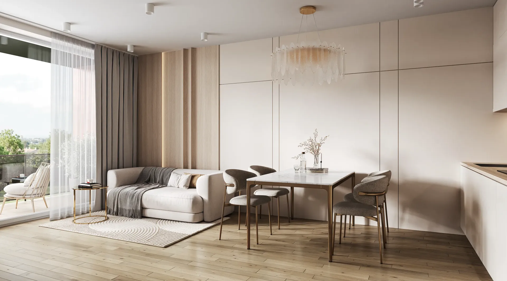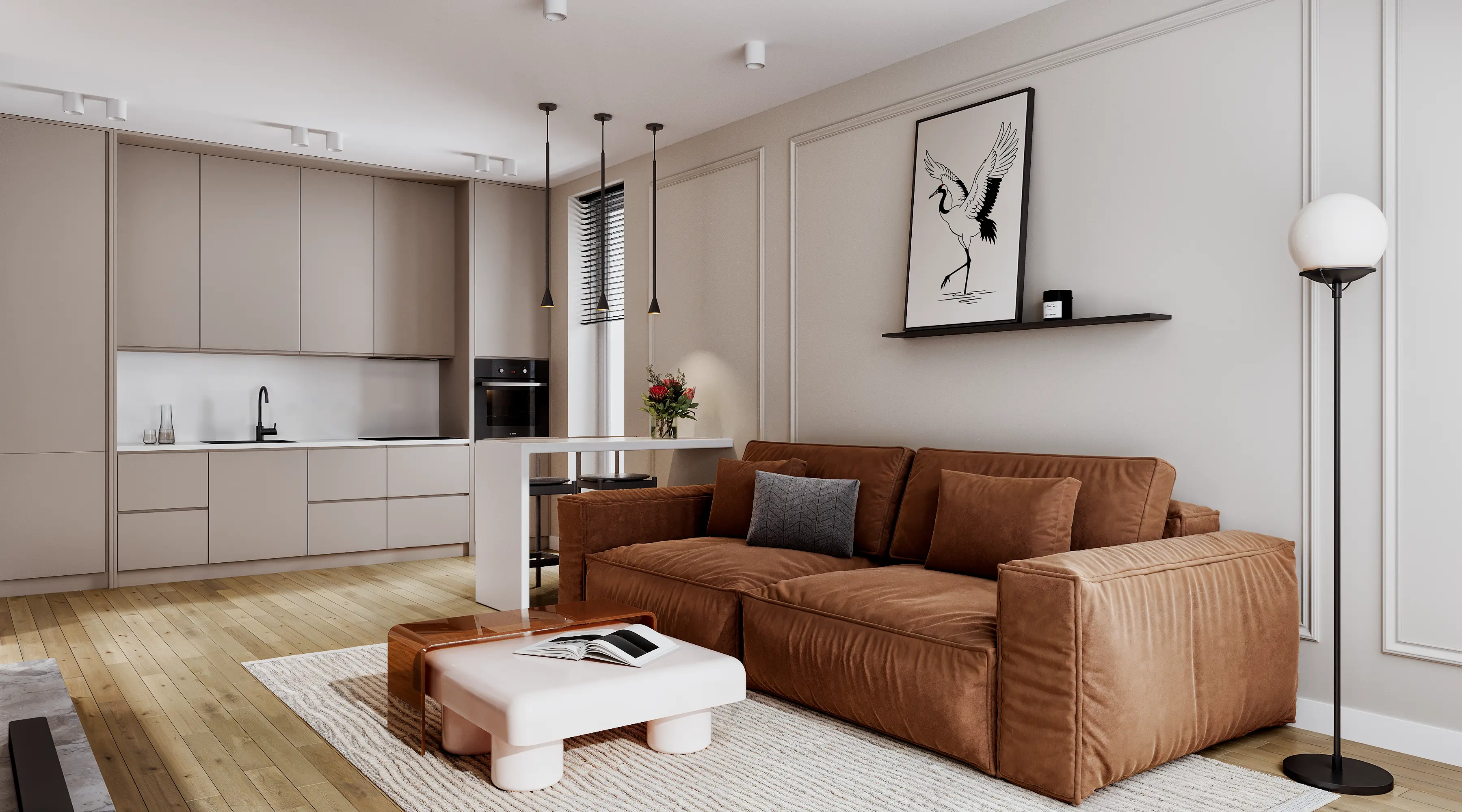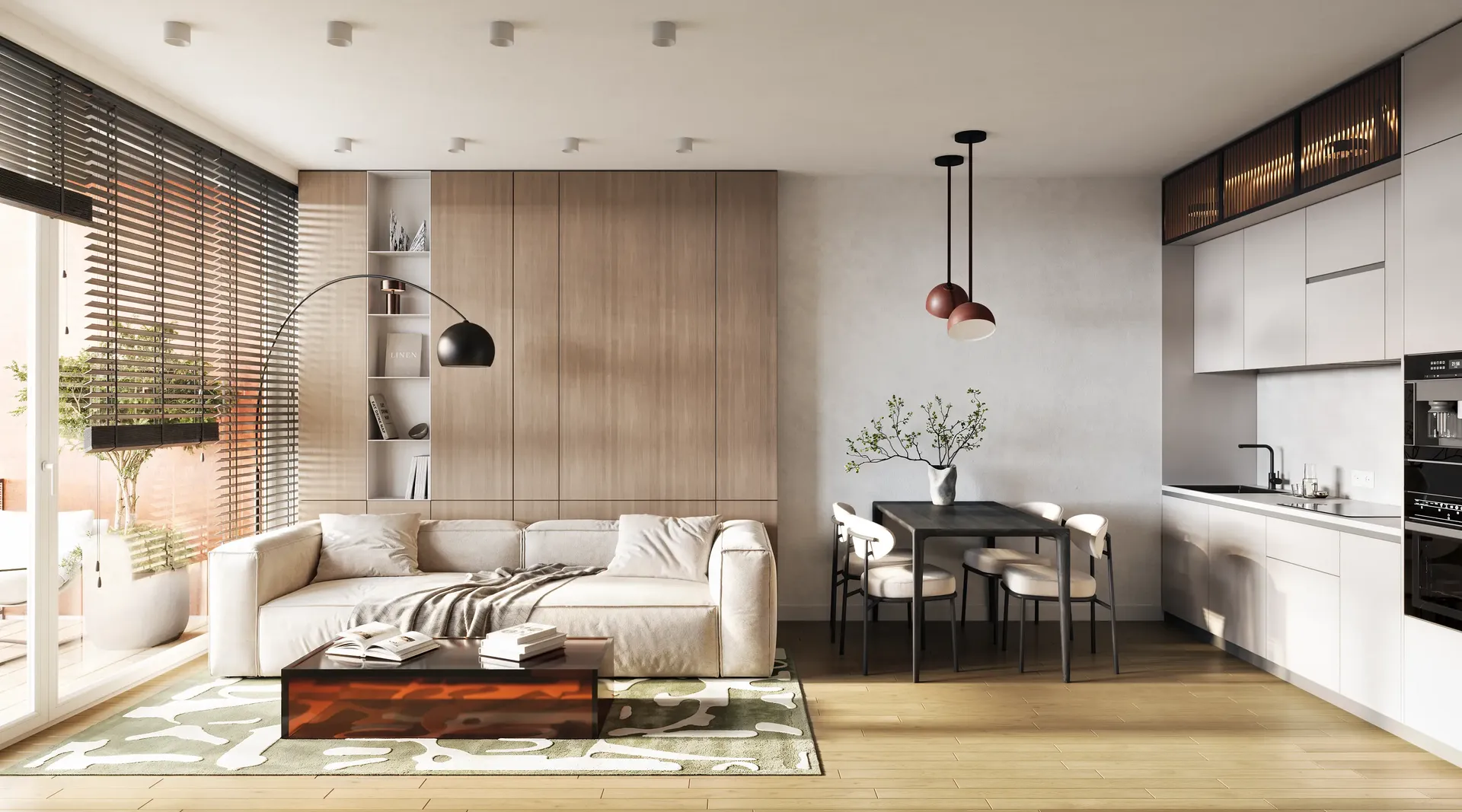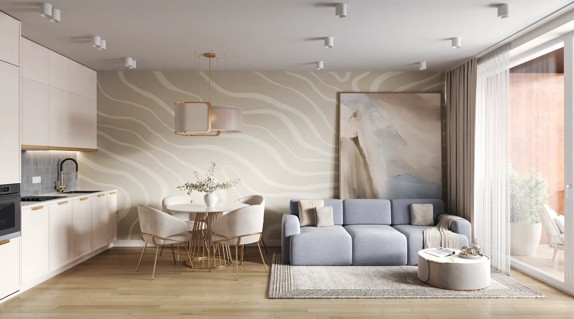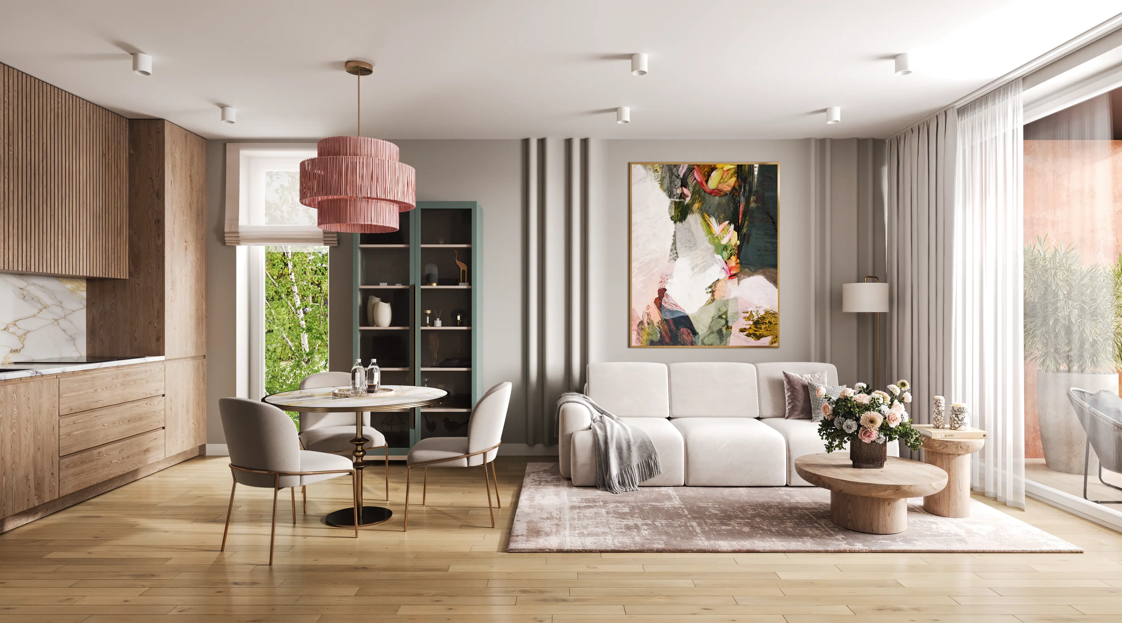 We solved the main problem of typical residential developments. The property catalog should not look like a boring grid of identical images. Our team developed twenty-four unique interior designs for the kitchen-living rooms. The room geometry remained unchanged. Every apartment received its own unique character and an attractive hero-render.