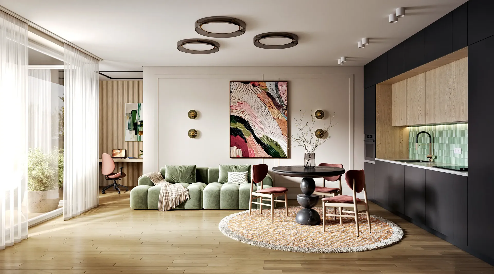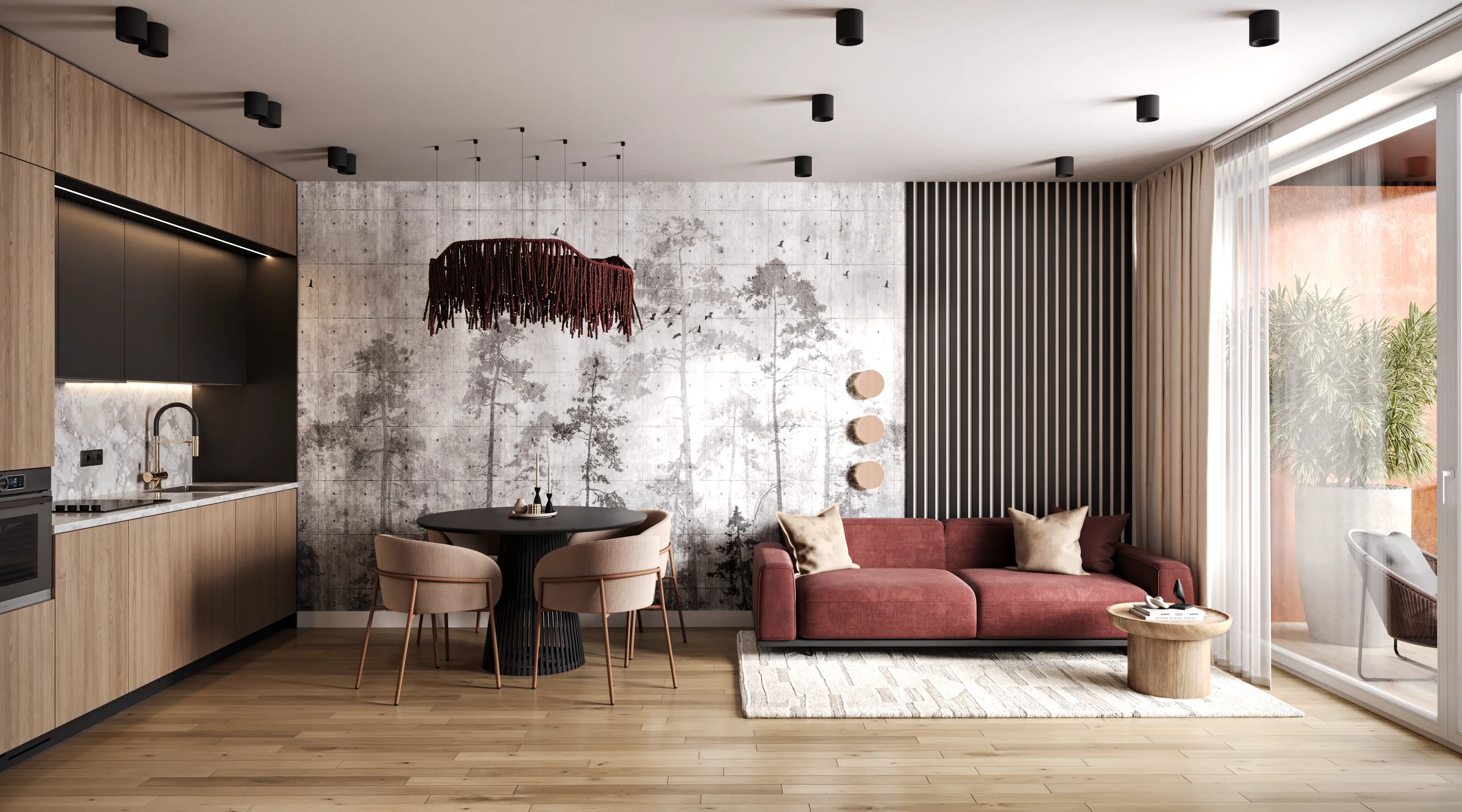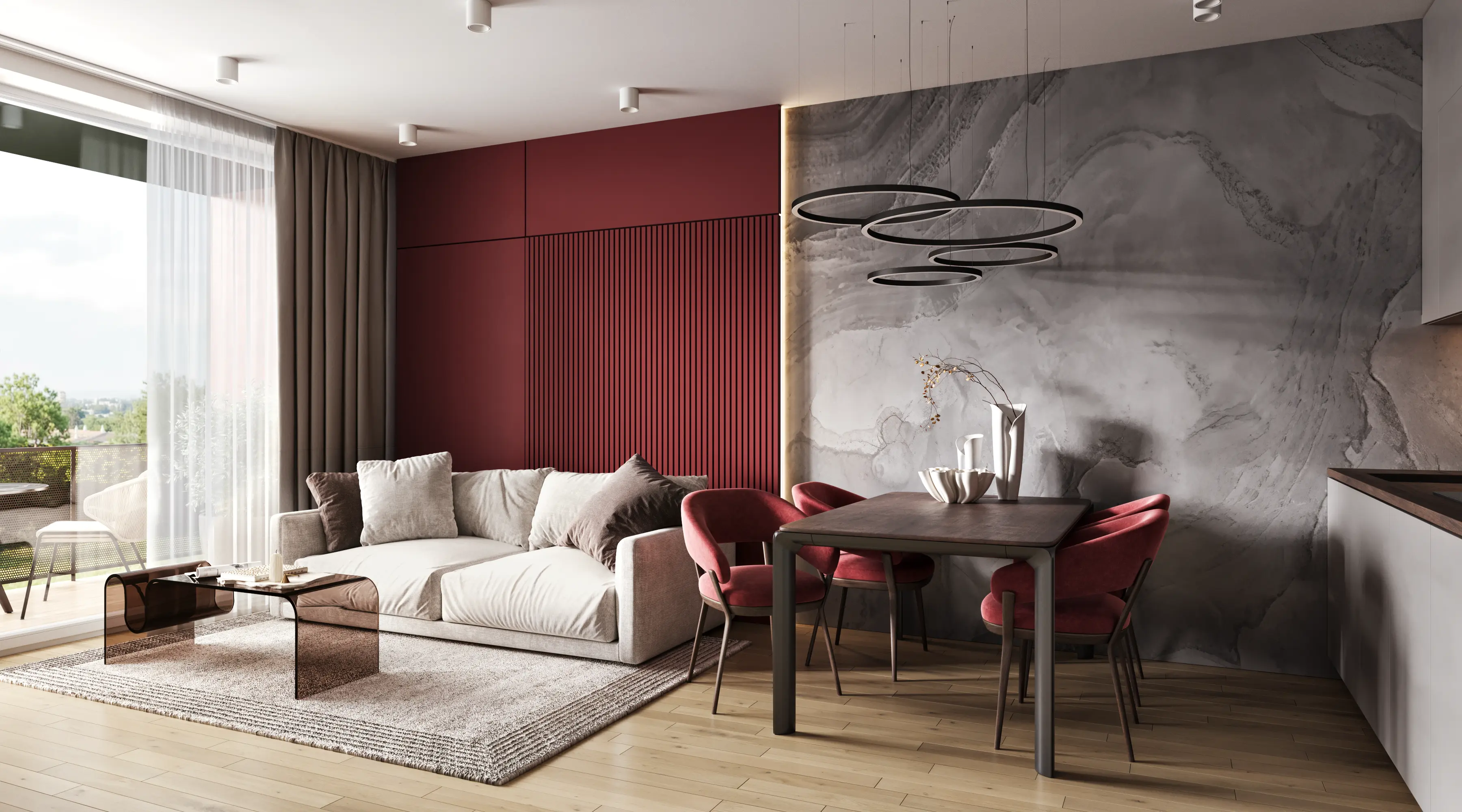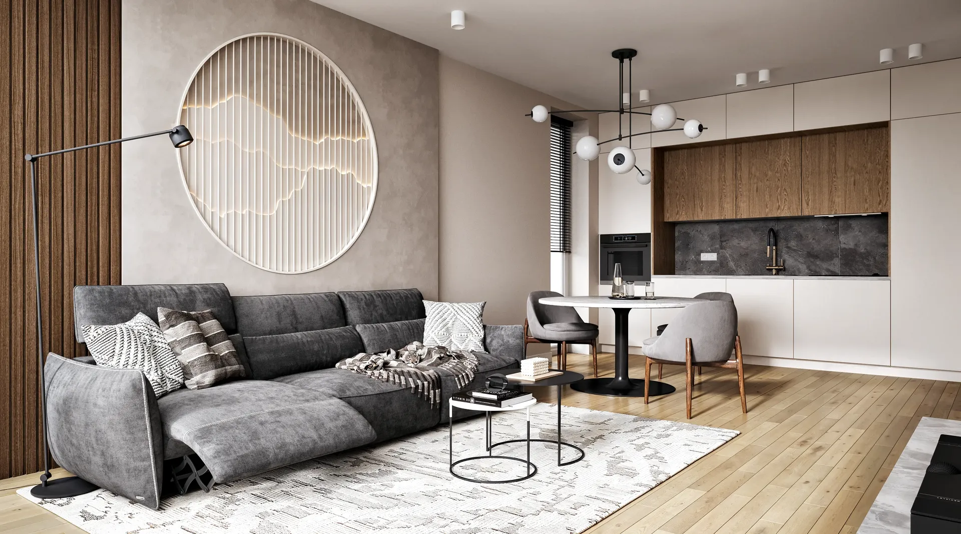 We solved the main problem of typical residential developments. The property catalog should not look like a boring grid of identical images. Our team developed twenty-four unique interior designs for the kitchen-living rooms. The room geometry remained unchanged. Every apartment received its own unique character and an attractive hero-render.