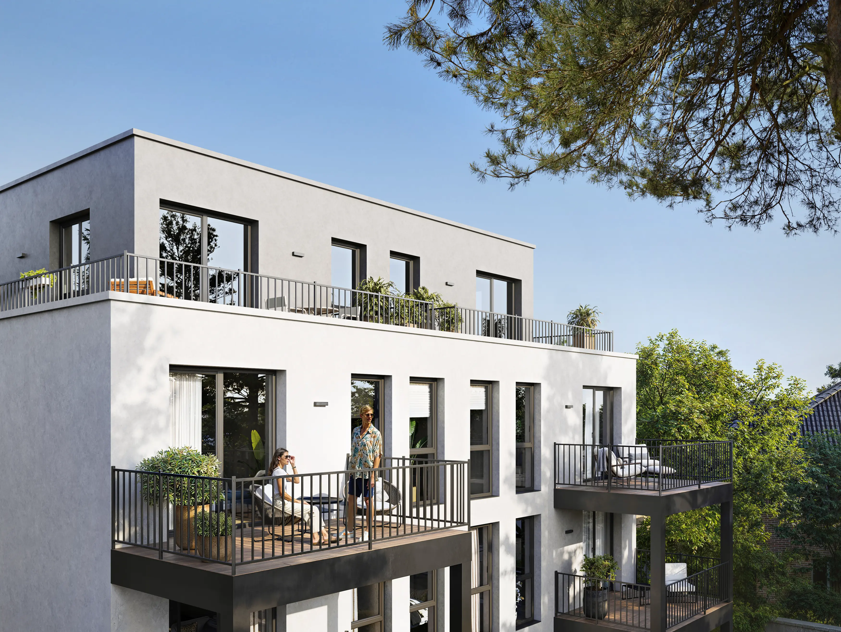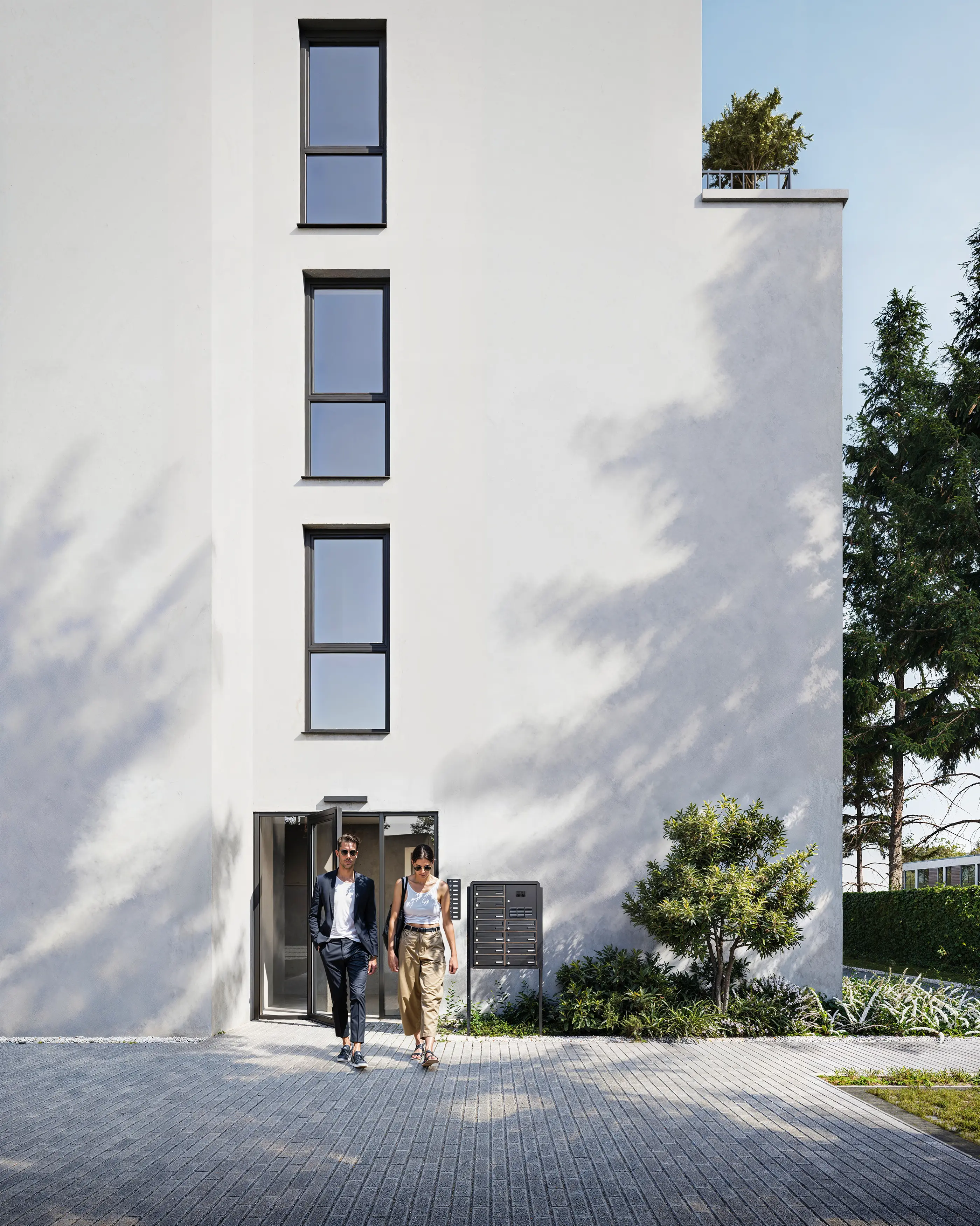 Complementing the row houses is the Multi-Family House. The clean white facade with dark metal accents creates a modern visual anchor for the district.We emphasized the generous balconies in the renders, proving that apartment living here still offers a strong connection to the outdoors and ample space for relaxation.