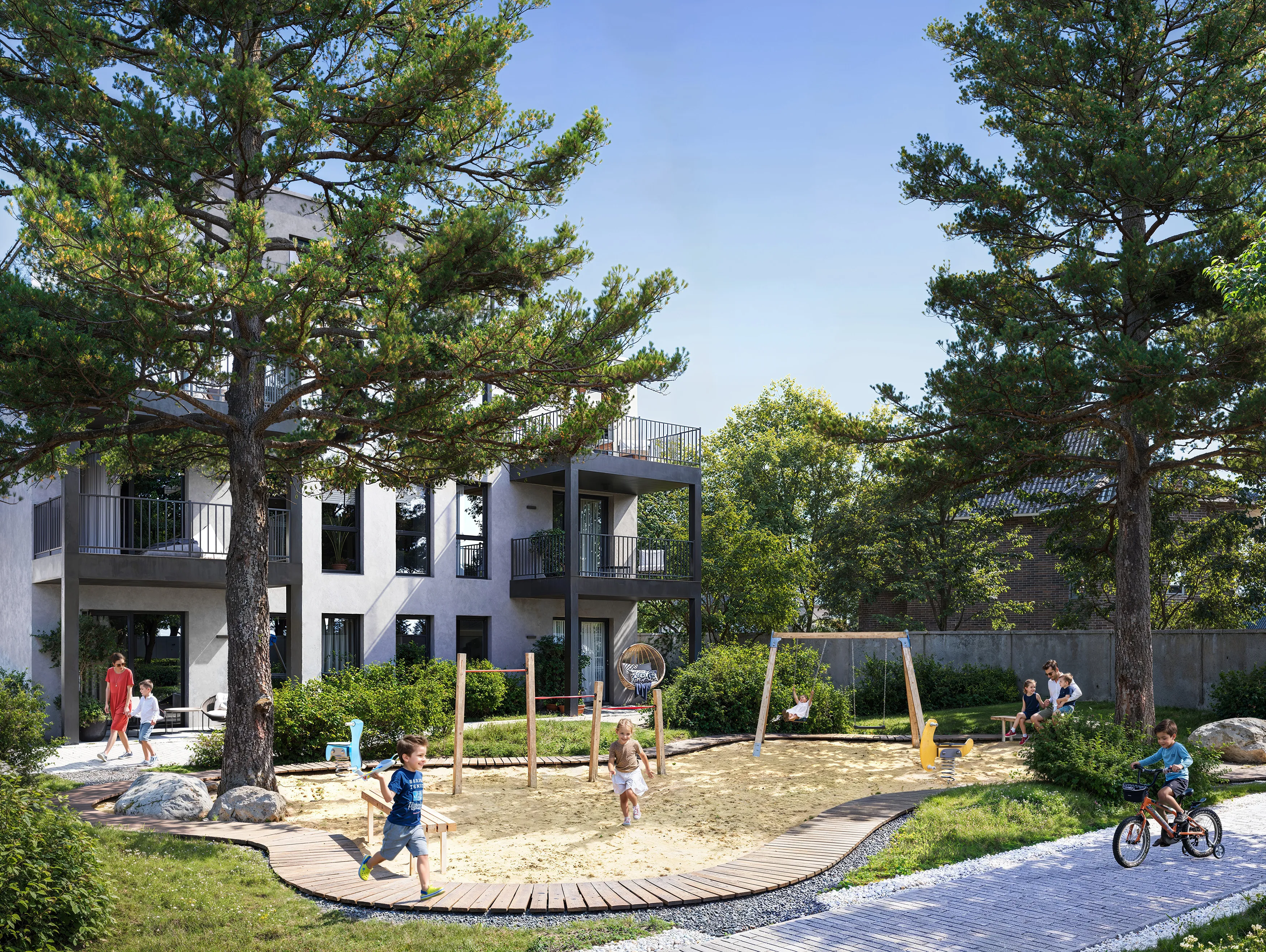 Day render highlights the lush greenery and the space for family activities under the sun.