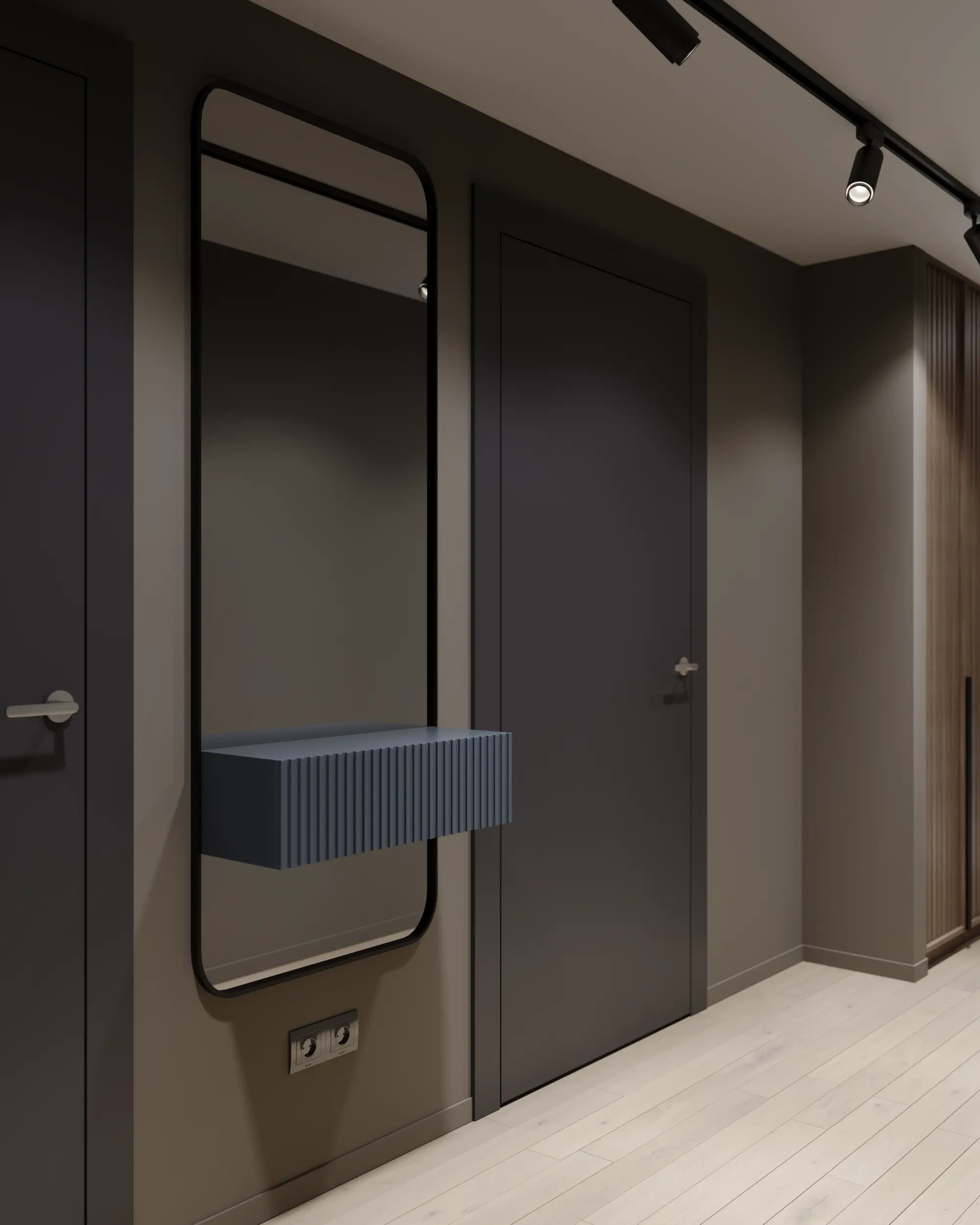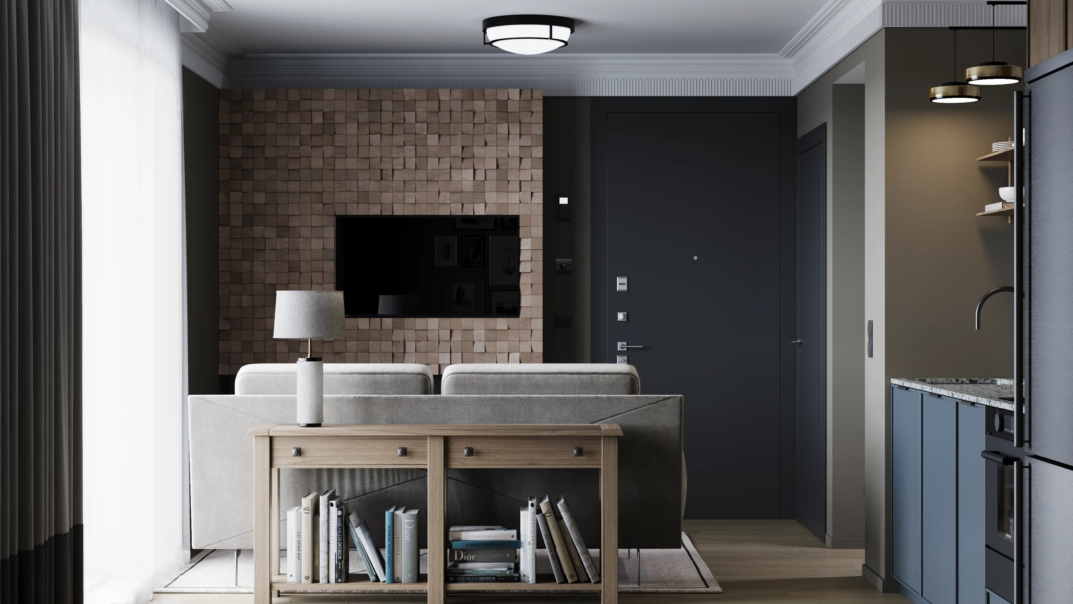 For the lower units, we moved away from the standard "neutral" look to create a distinct, sophisticated character. The concept features a bold, moody palette with deep taupe walls and accent blue cabinetry. Elements like the gallery wall and wood-slat paneling add a layer of "eclectic comfort," appealing to buyers looking for a stylish, ready-to-live-in atmosphere.