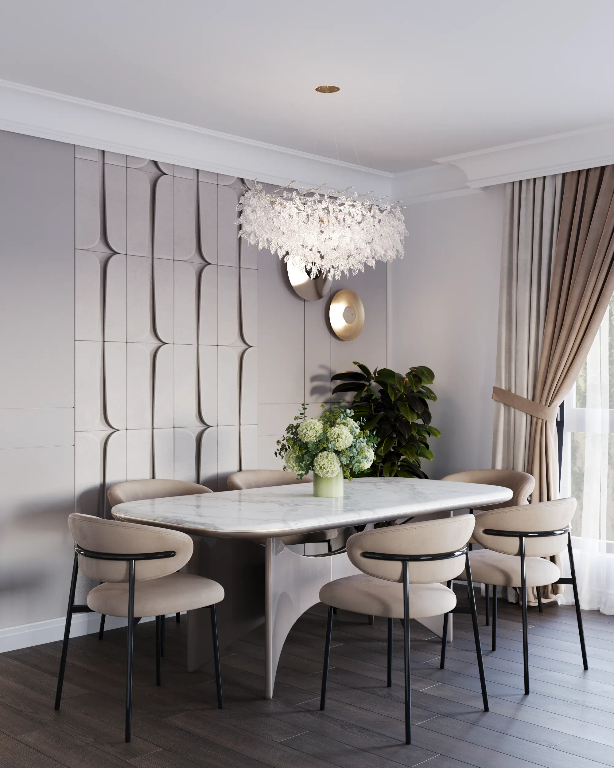 The dining area flows logically from the living room. The "show kitchen" features sleek marble islands and hidden appliances, serving as a beautiful extension of the social space rather than just a utility zone.