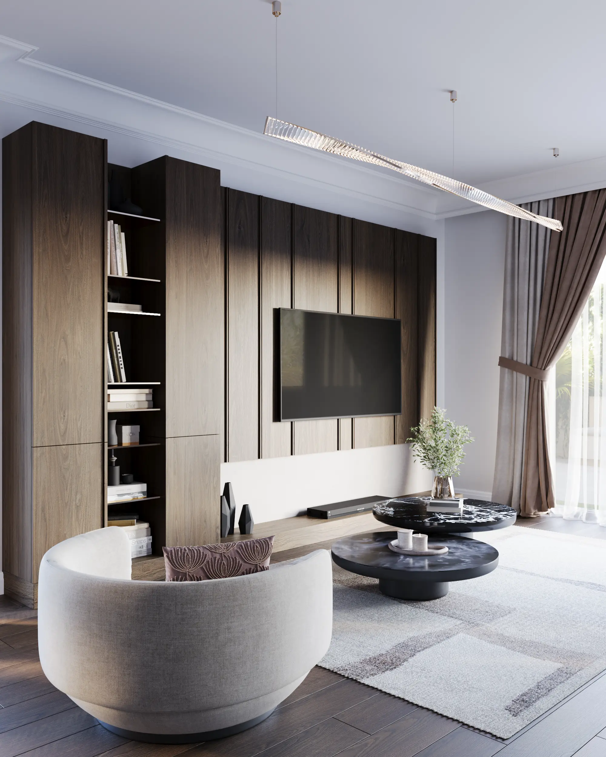The main living room features high ceilings, marble flooring, and wood paneling with integrated lighting. It visualizes the perfect balance between the warmth of a family home and the sophistication of a luxury hotel.