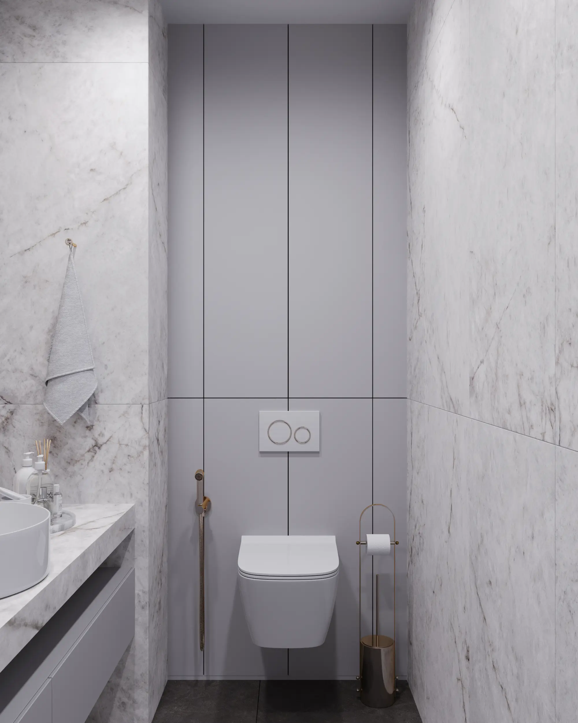 To support the hospitality function, we visualized two separate guest washrooms in a unified style and an integrated functional storage room, showing that practical needs are met without compromising aesthetics.