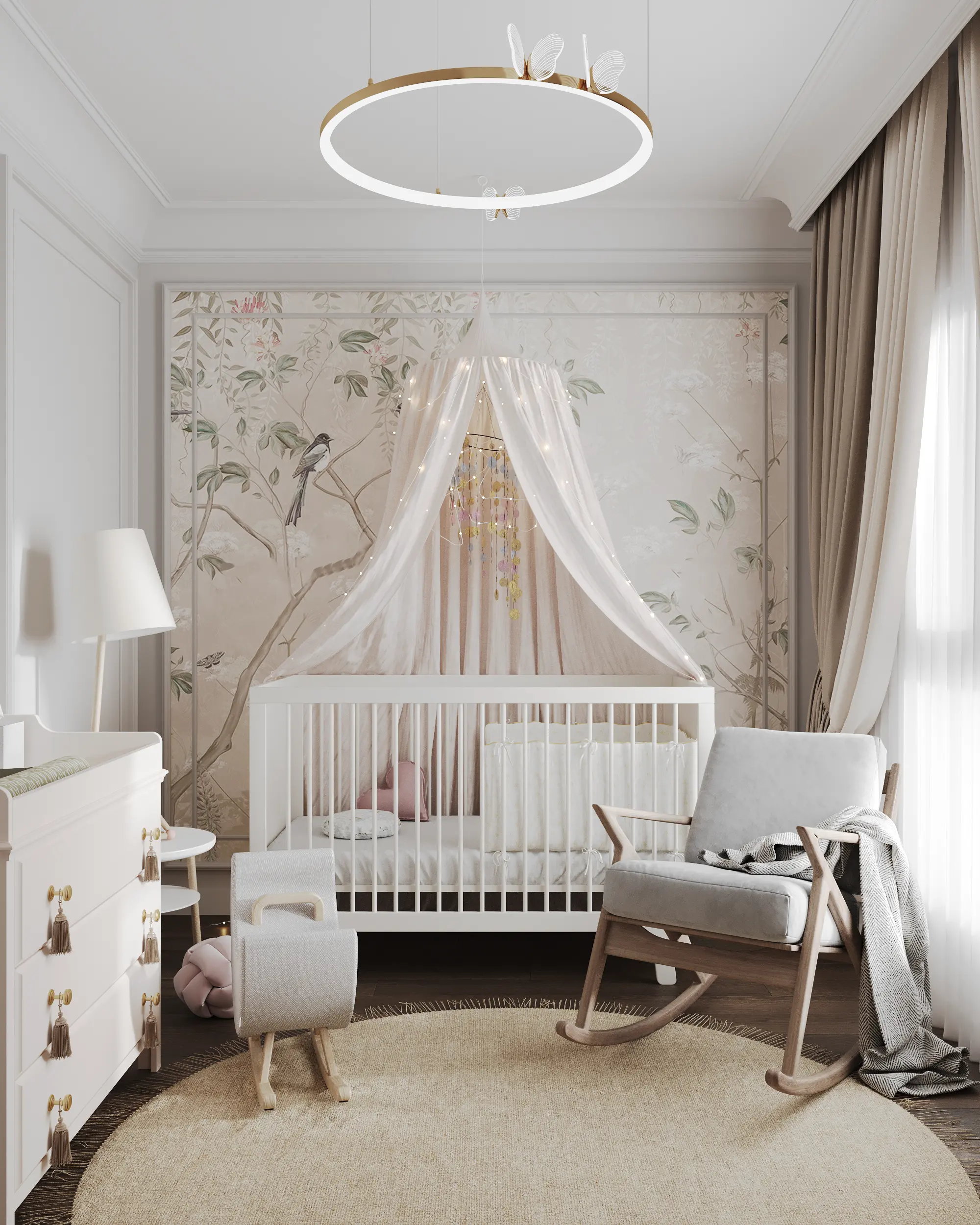 Teen Room designed with a dedicated workspace and shelving for study. Nursery is a cozy, safe space for the toddler with a crib and play area. Both rooms are located near the hall bathroom, optimizing the flow for the children.