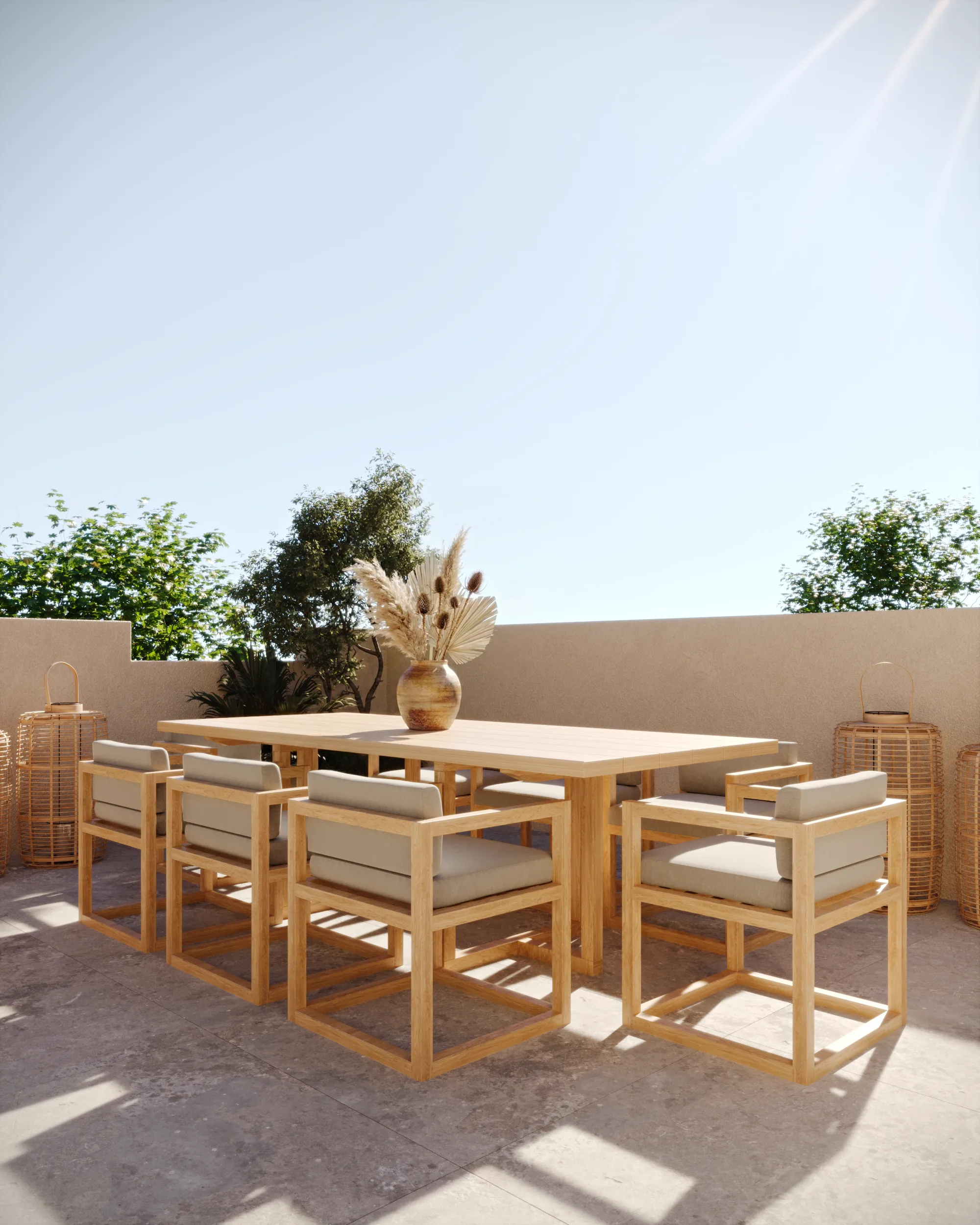 The spacious terrace is visualized as a private oasis with dining furniture and lush greenery. It demonstrates the perfect spot for the family to enjoy the cooling evening air in total privacy.