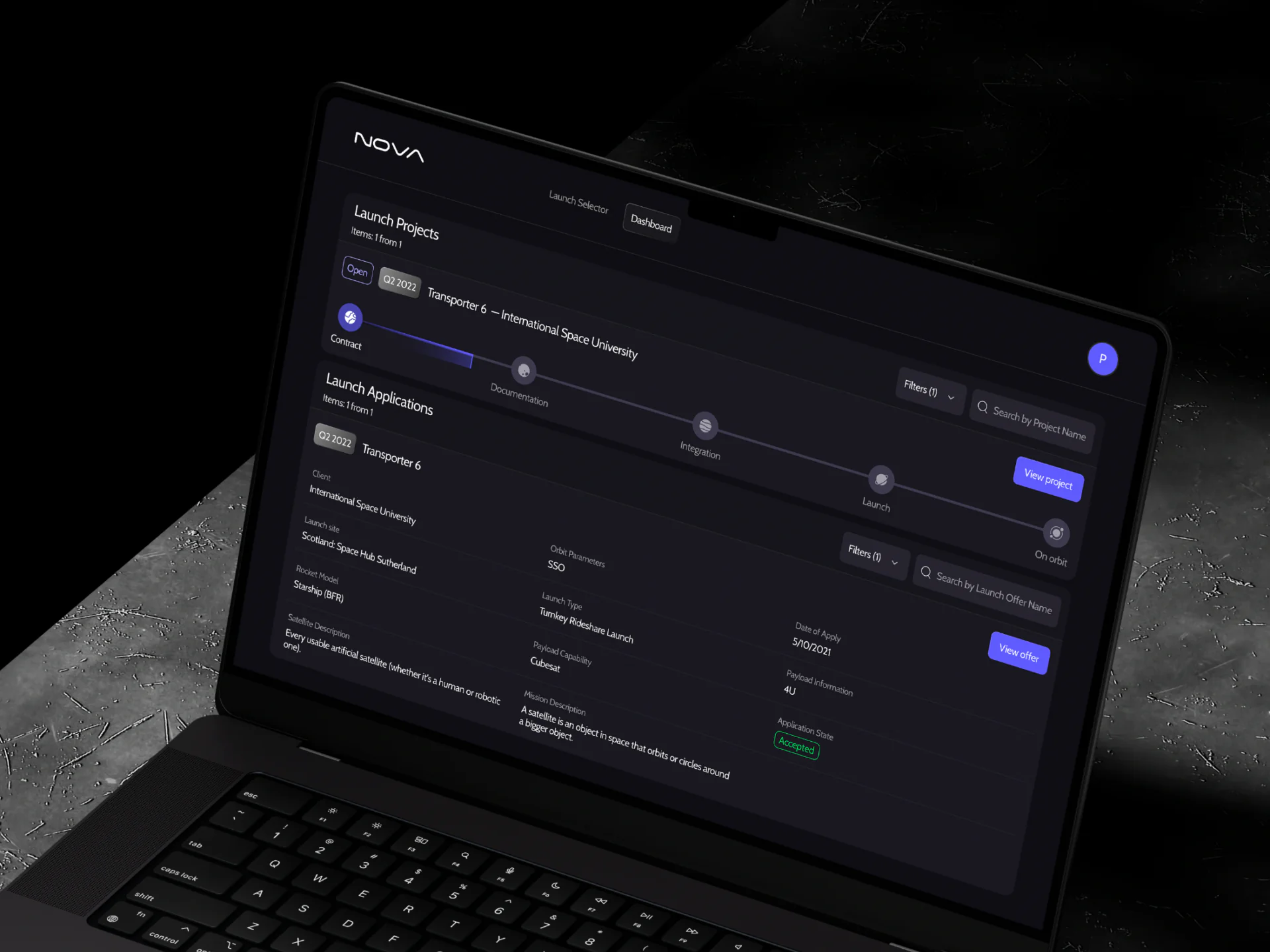 The Nova Dashboard is an all-in-one interface for tracking and managing satellite launch projects. It provides a clear, user-friendly view of mission progress, key milestones, and project details—helping teams stay aligned, make faster decisions, and keep launches on schedule.