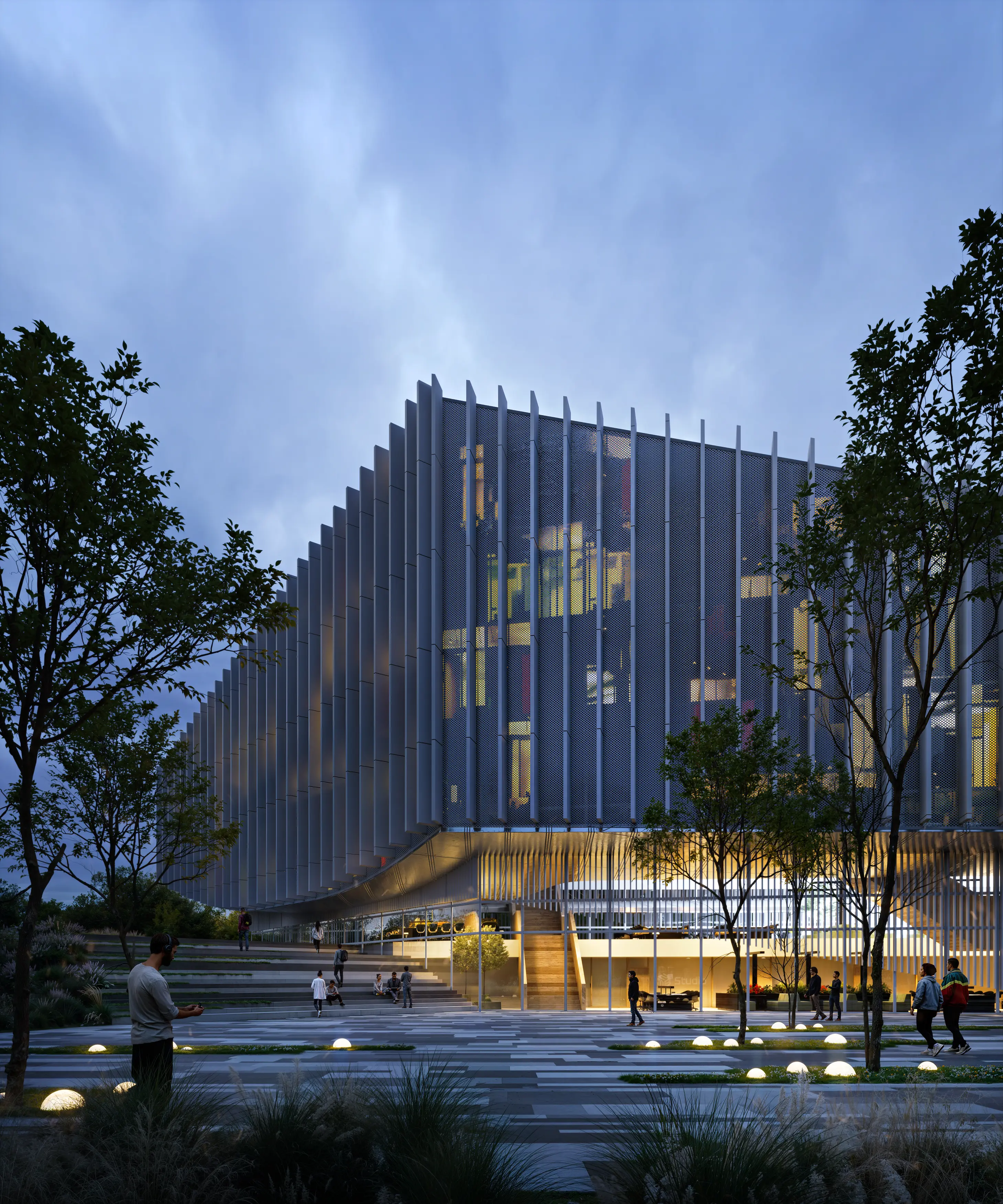 At the core of our visual research lies the concept of a dynamic, rhythmic façade. Vertical louvers create a complex interplay of light and shadow, shifting the building's appearance depending on the vantage point. This daylight render allows for a detailed examination of the form's purity and structural complexity. Our goal was to demonstrate how a bold architectural idea translates into realistic sunlight, emphasizing its scale and monumental character.