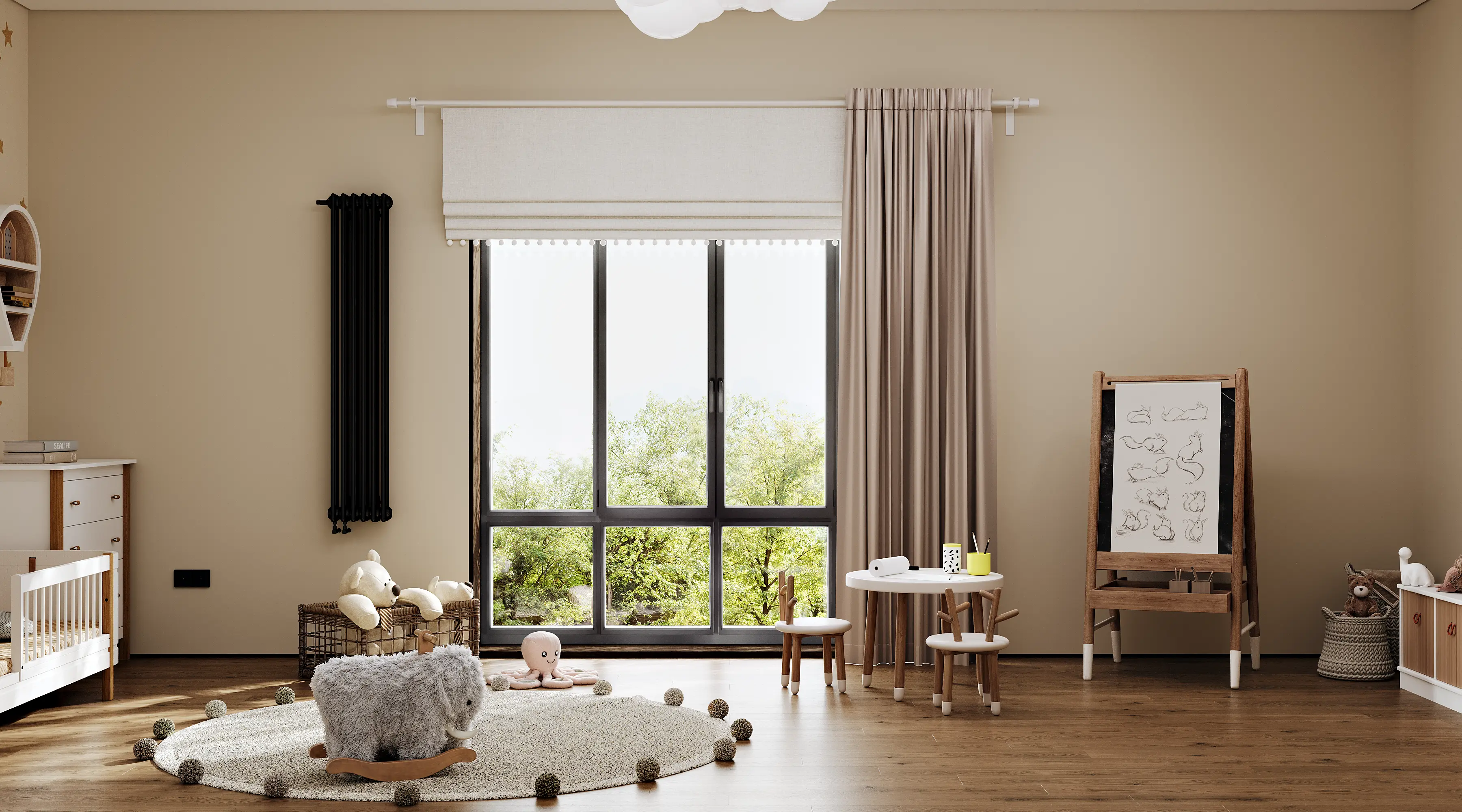 The nursery is both functional and comfortable. We visualized furniture with simple, modern forms made from natural materials, creating a safe and inspiring environment for play and rest.