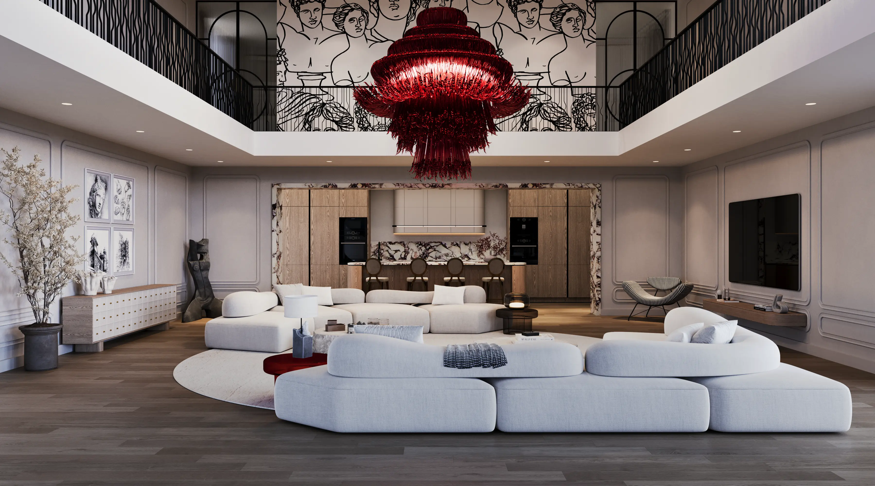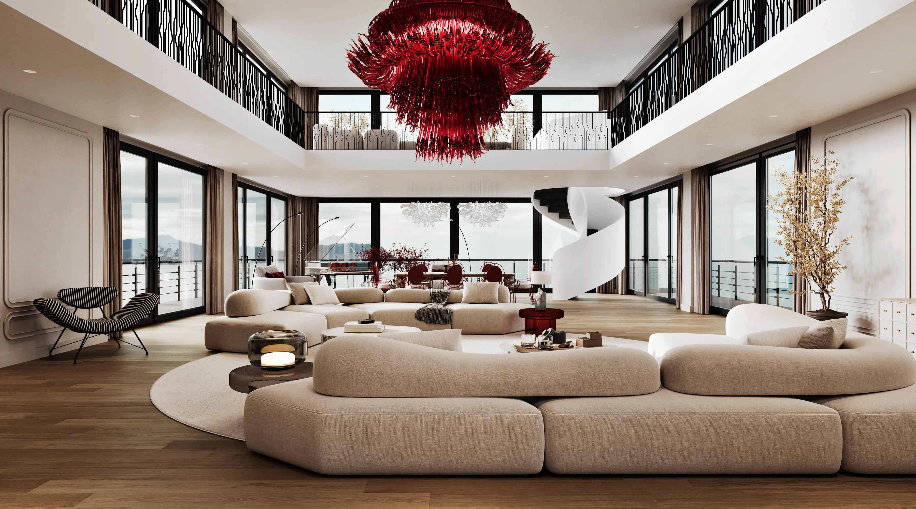 The vibrant red chandelier acts as a powerful "high note" in the composition. It adds a touch of drama and avant-garde flair to the otherwise calm palette, serving as the central art piece of the villa.