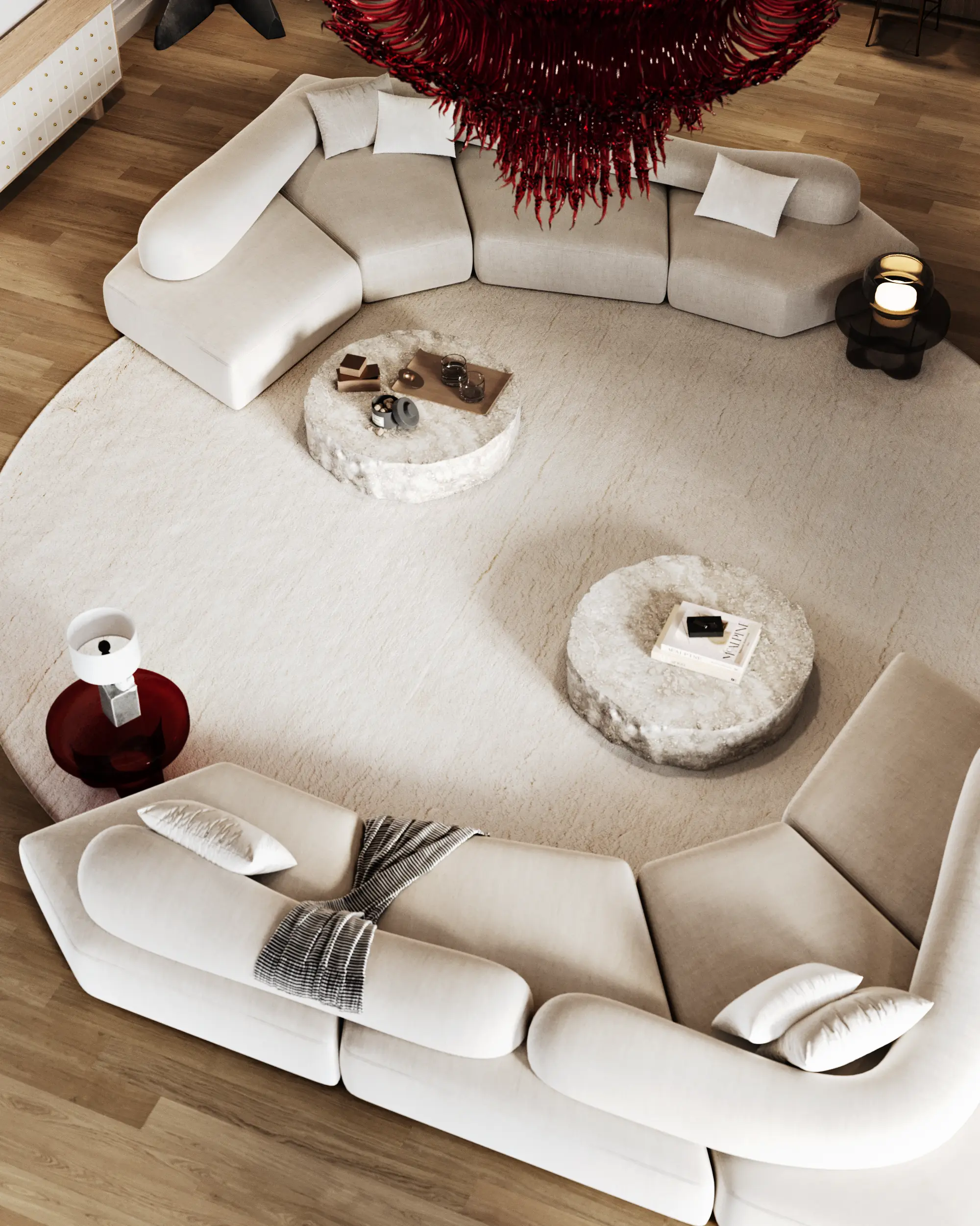 The circular sofa arrangement creates an inviting "social circle" for guests to gather, talk, and listen to music, while the white spiral staircase winds upward like a sculptural ribbon.