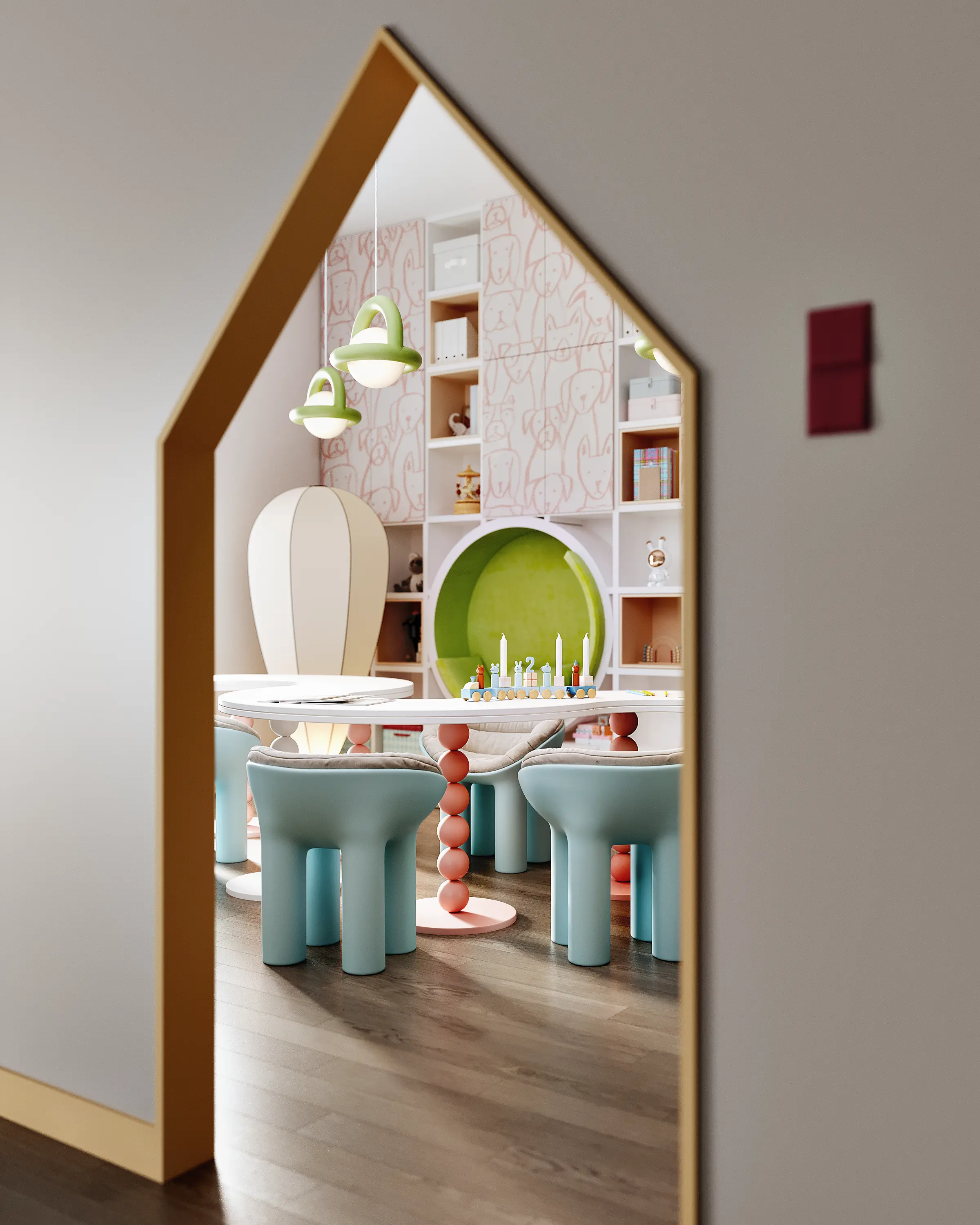 Every corner tells a story. From the soft play area with colorful mats to the house-shaped doorways leading to secret rooms, the design encourages exploration. We focused on rendering the tactile softness of the materials to reassure parents of the environment's safety.