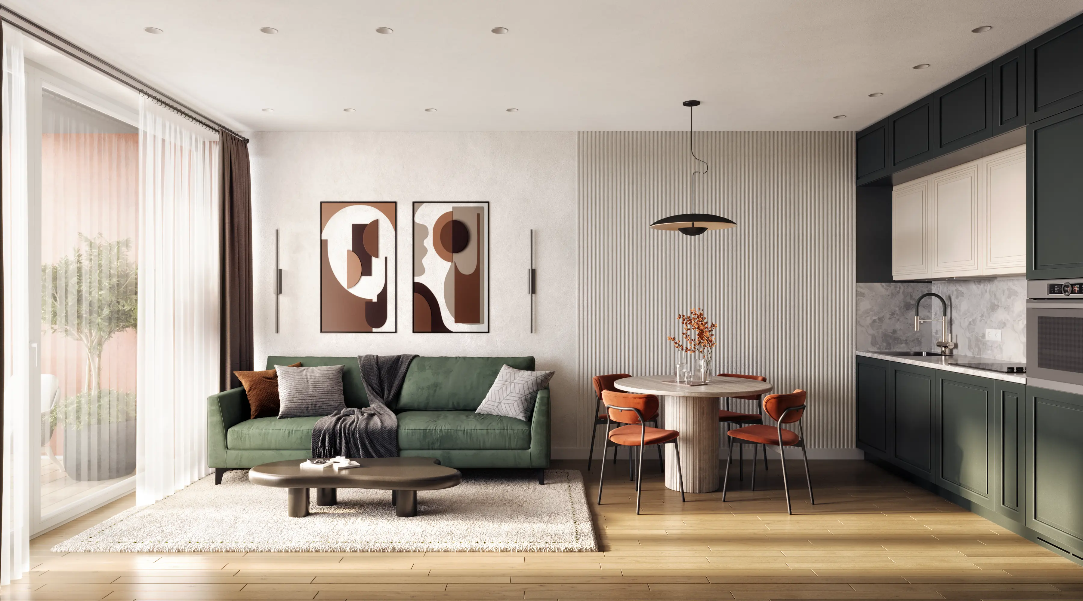 We solved the main problem of typical residential developments. The property catalog should not look like a boring grid of identical images. Our team developed twenty-four unique interior designs for the kitchen-living rooms. The room geometry remained unchanged. Every apartment received its own unique character and an attractive hero-render.