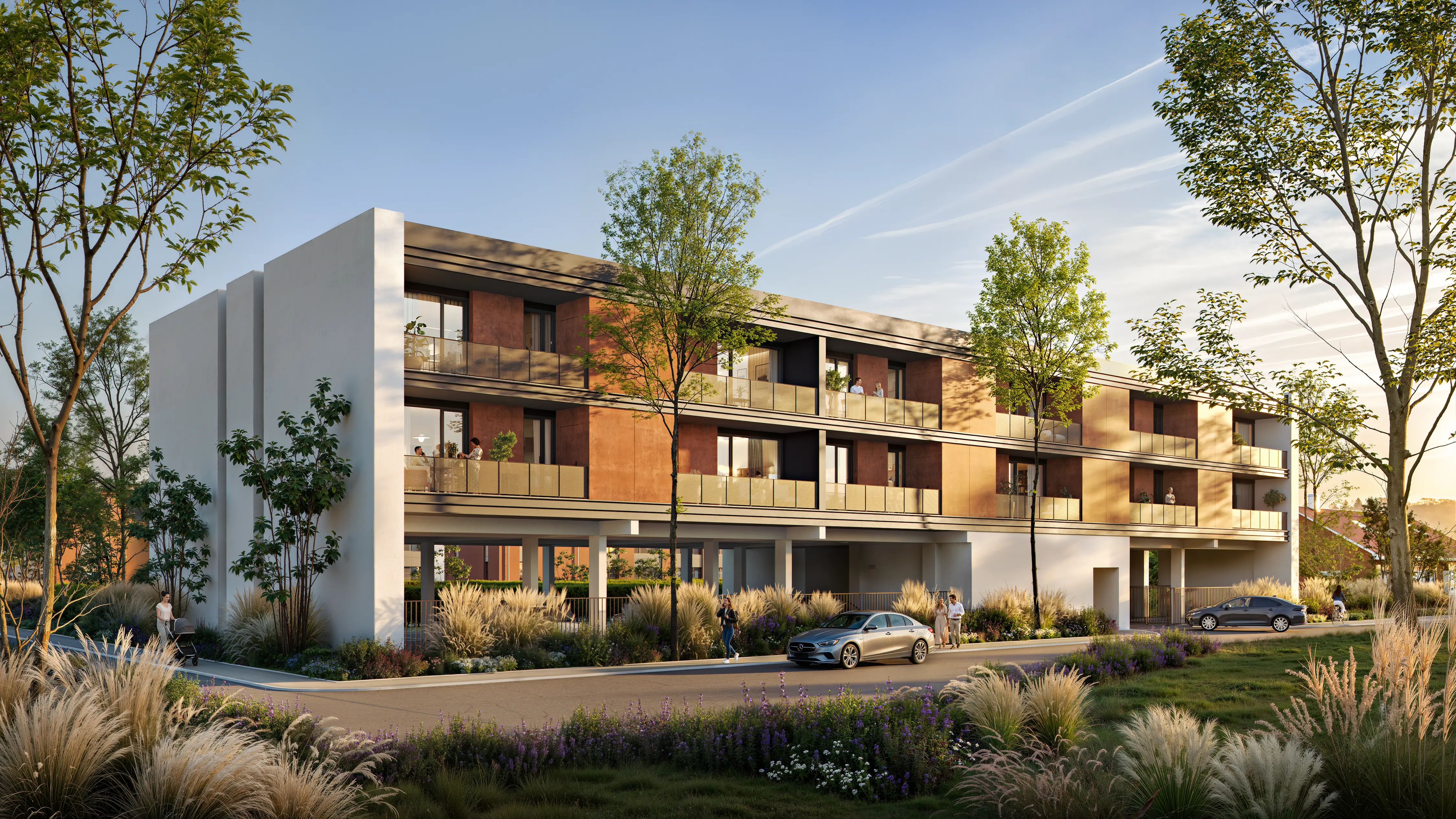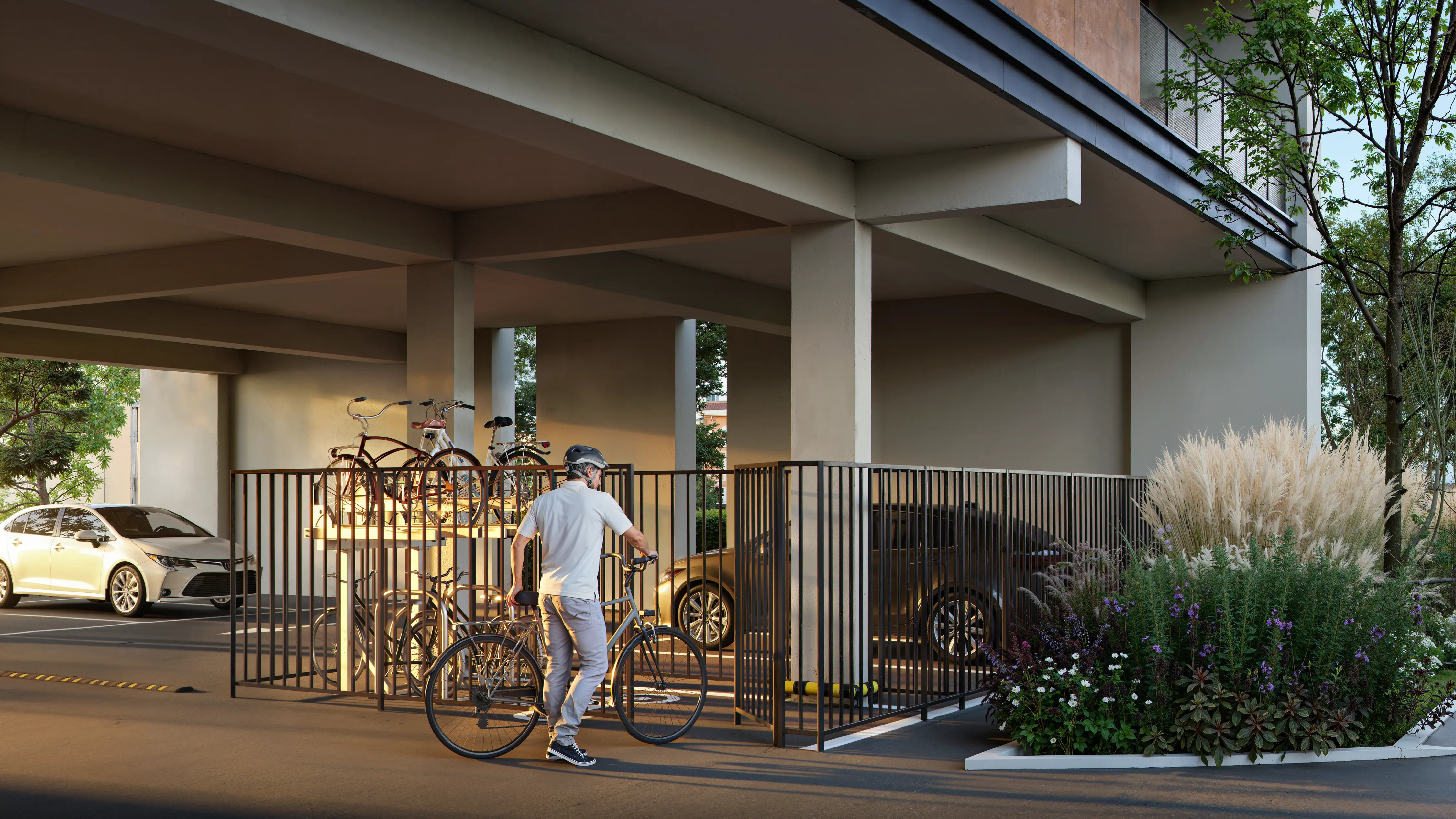 We visually emphasized the comfort of living in the new building. Cozy spacious balconies create an atmosphere of private relaxation. A modern bicycle parking area highlights care for the comfort of future residents.
