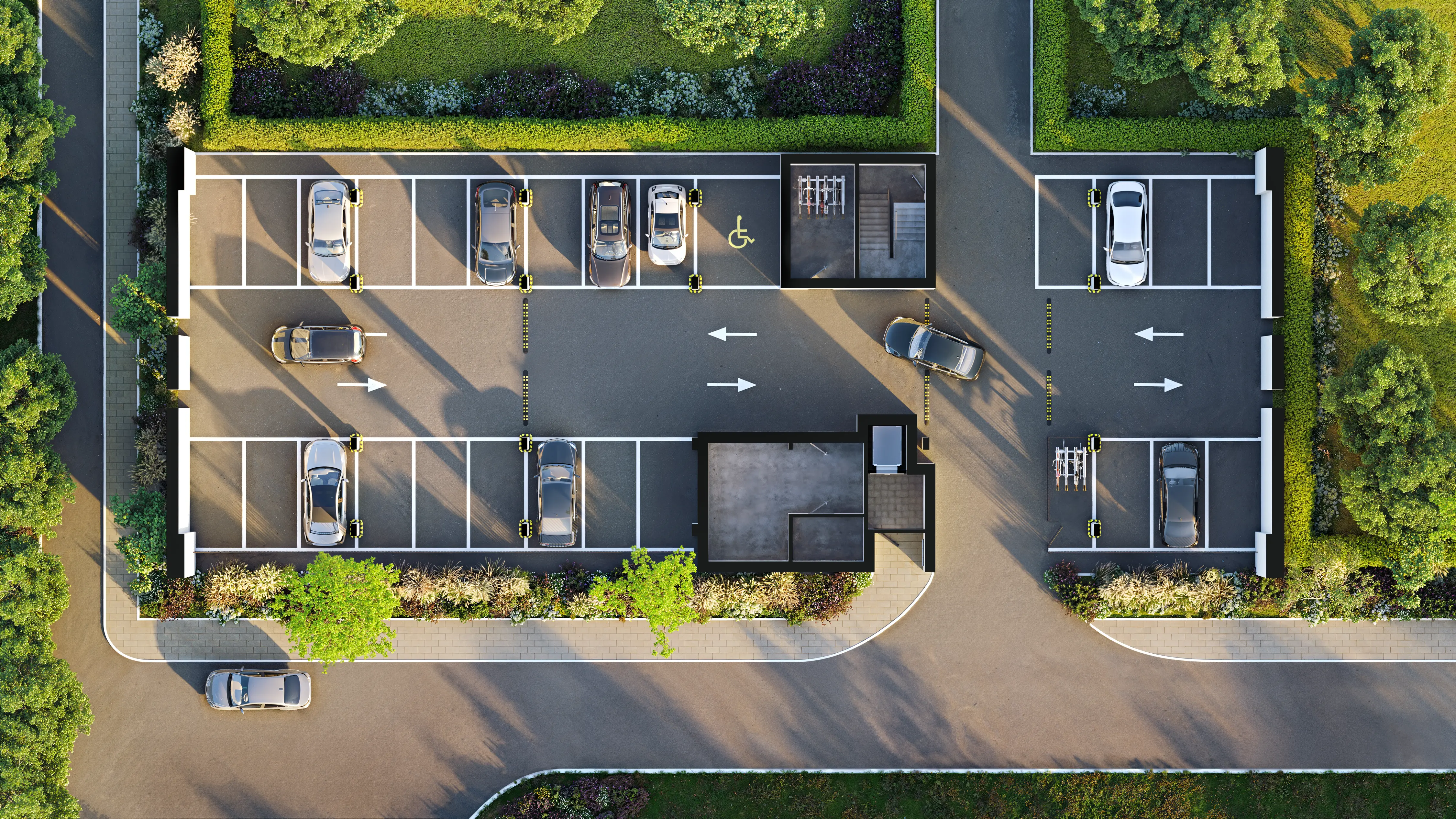 We showed the covered parking from eye level to convey a realistic atmosphere. Additionally we developed a detailed top-down view. This comprehensive master-plan is perfect for website integration. Buyers can easily choose and book parking spaces online.